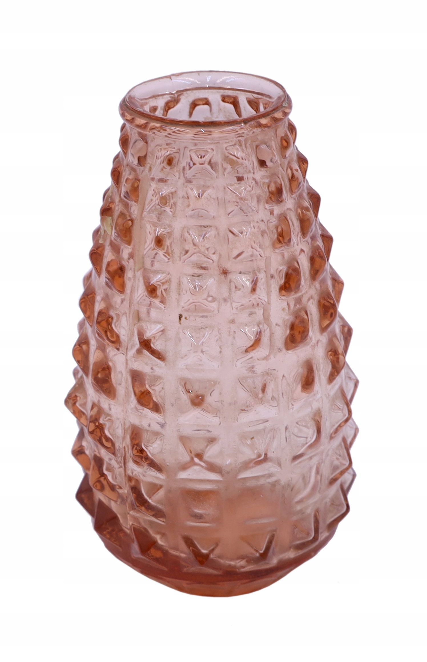 Стеклянная ваза лосося от Зомбковицкого стекольного завода периода Польской Народной Республики. В каталоге Хута номер модели 7035. Стекло прессованное, окрашенное в массе. Следы использования. Размеры: высота 14 х 7,5 см. Рекомендую