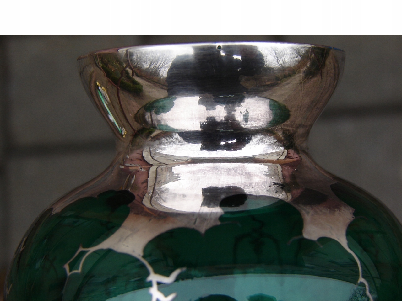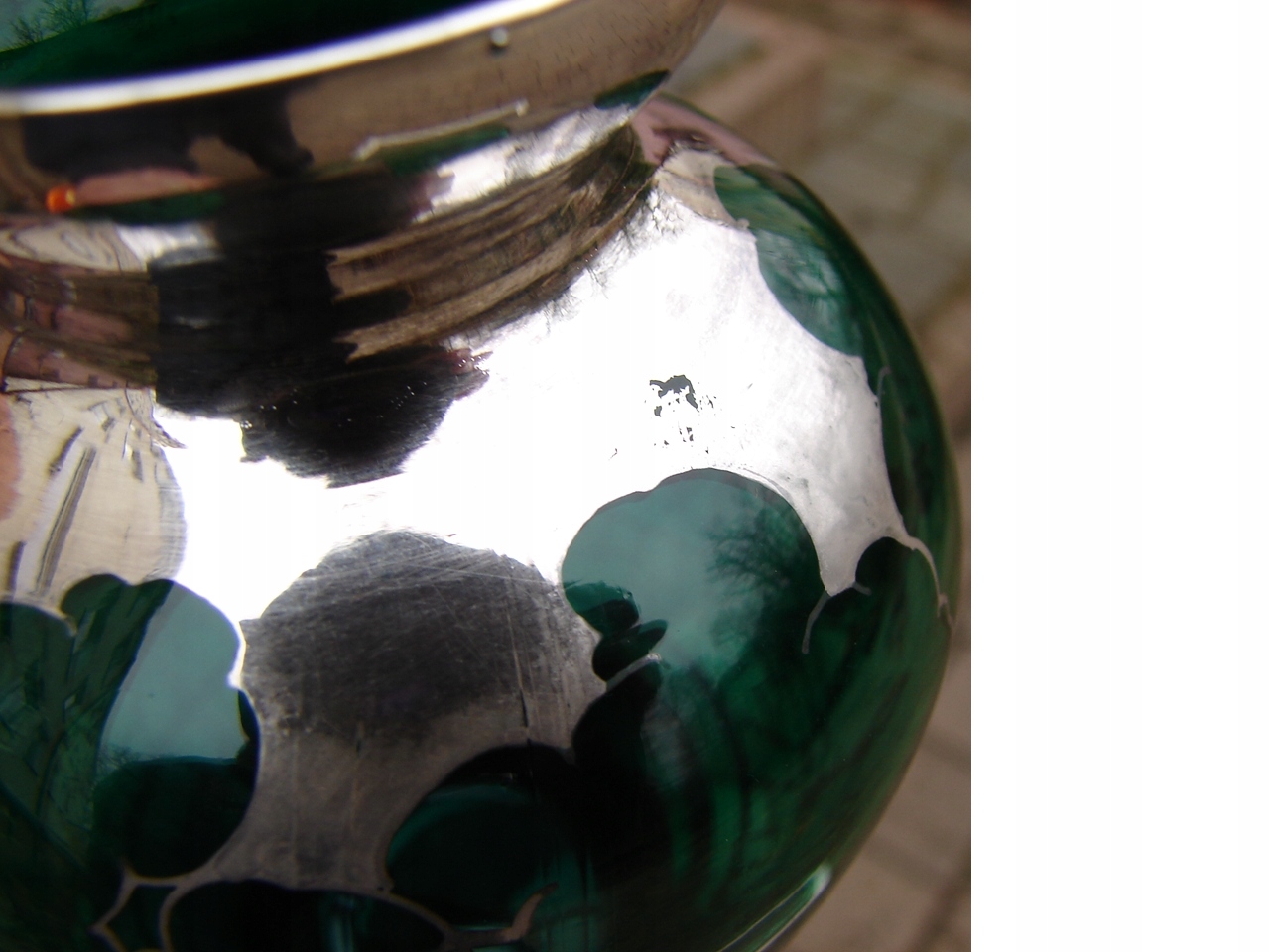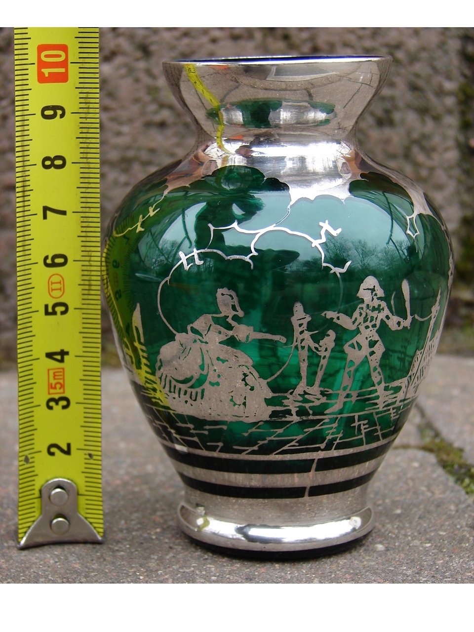 Винтажный декоративный вазовый стекло в цвете сочного зеленого, украшенного чистым серебром. Метки. Трещины имеют локально незначительные царапины обрезки серебряных сил и незначительных дефектов, которые не влияют на внешний вид объекта. Твердый Я отправляю товары только один раз в неделю в среду после платежа, поэтому, если платеж будет в среду, товар будет достигнут быстрее. Если для этой доставки в следующую среду
