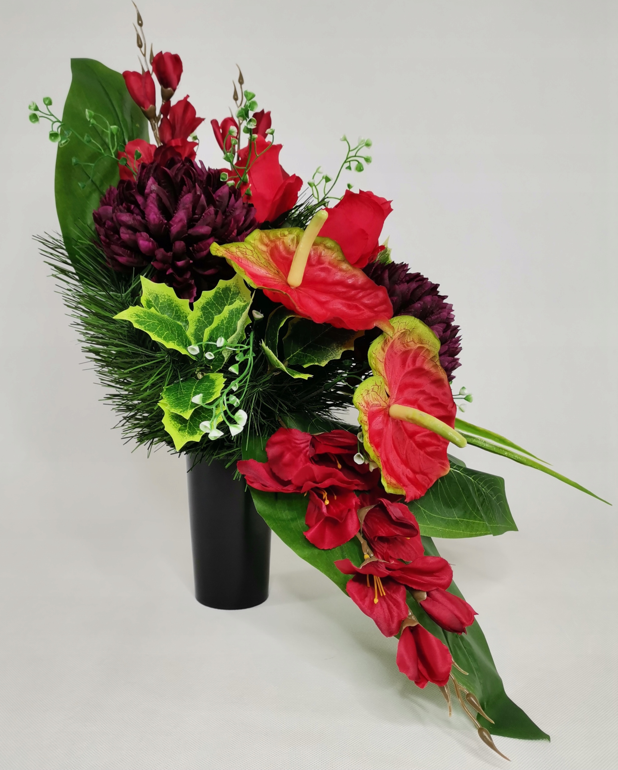 В данном аукционе представлен букет (ВАЗА-ВСТАВКА) в красном и фиолетовом цветах, с зелеными элементами.