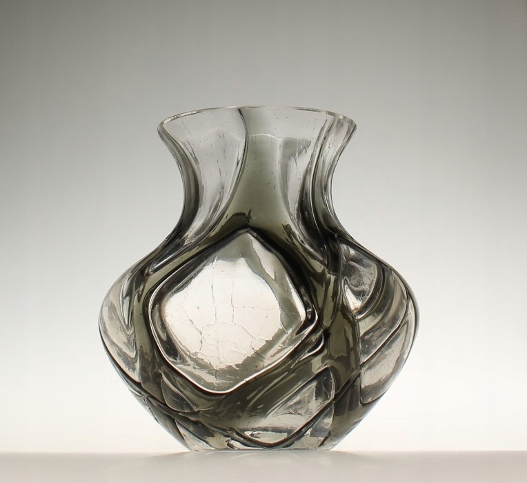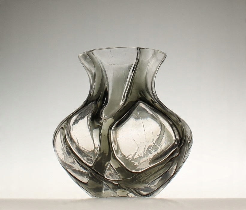 Выпуклая ваза из натриевого стекла ручной формовки. Брюшко бесцветное с коричневой оплёткой, снаружи покрыто стеклянным крапом. Ваза выполнена в стиле модерн. Происхождение неизвестно.