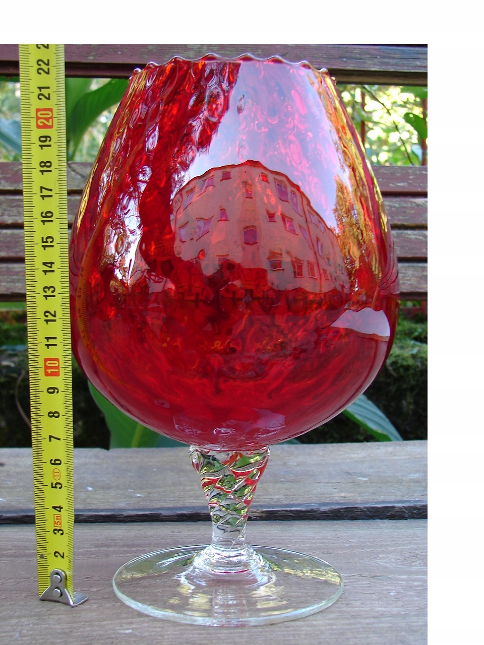 Ваза из дутого рубинового стекла в форме бокала для бренди.