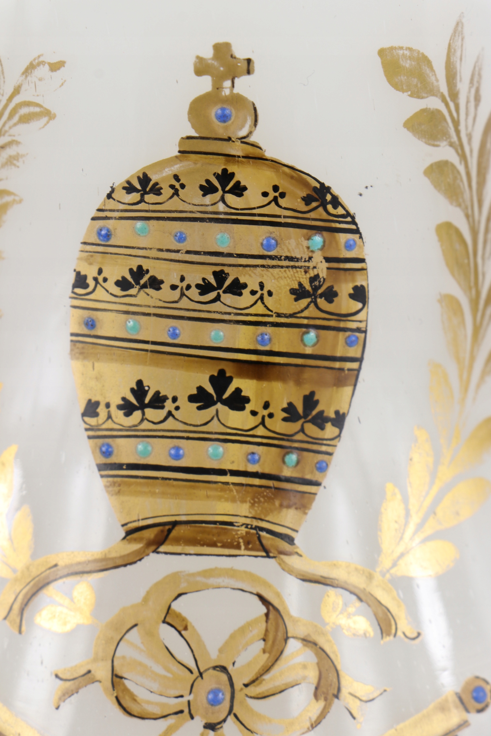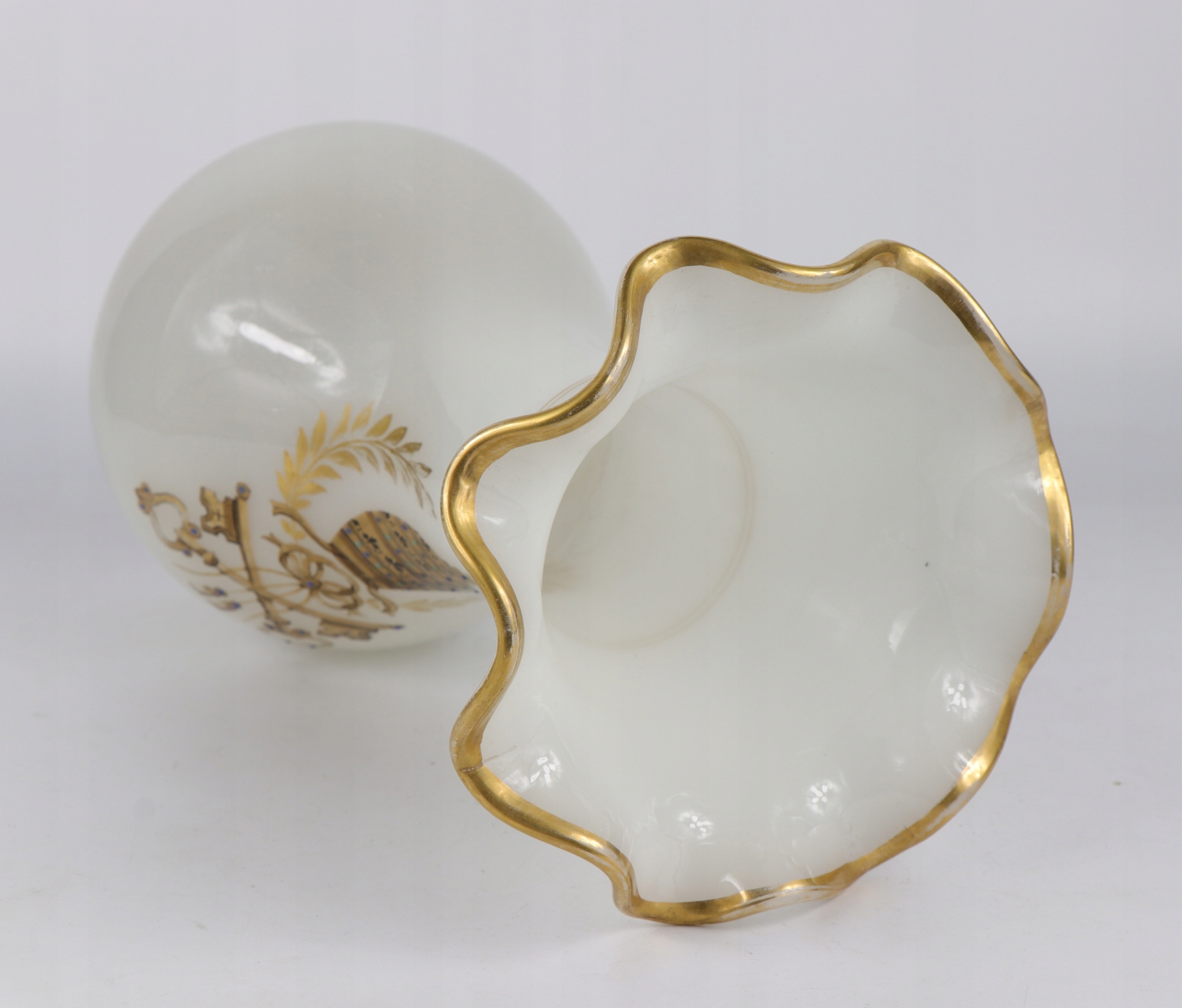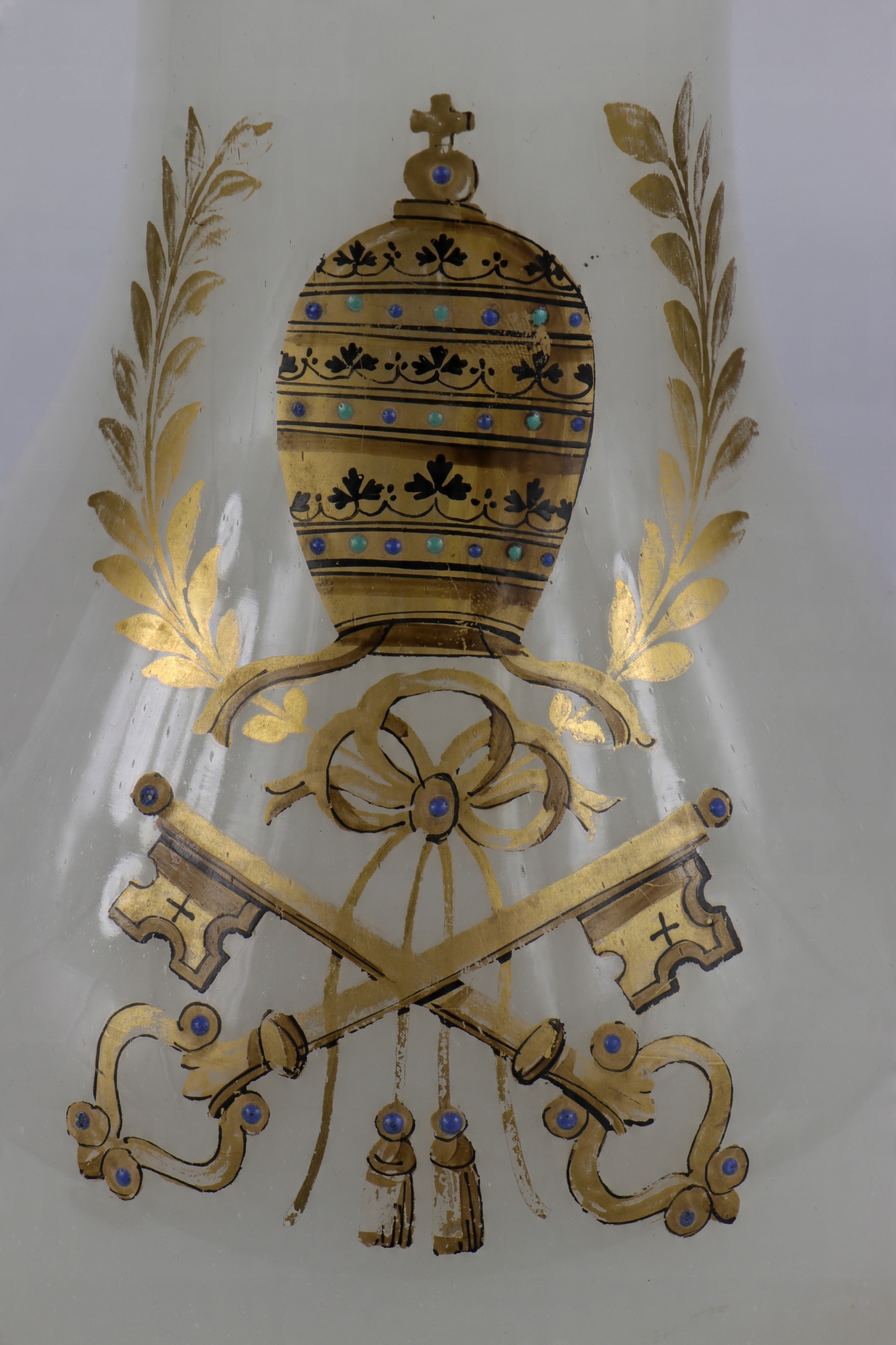 Очень интересная стеклянная стеклянная ваза из стекла из белого молока. На вазе, герб столицы Ватикана с папской митрой, Питером Кисом и Пальмами. В нижней части вазы прививка зоны покрытия характерна. Ручная рукавов, встреча с эмалевыми красками. Item
