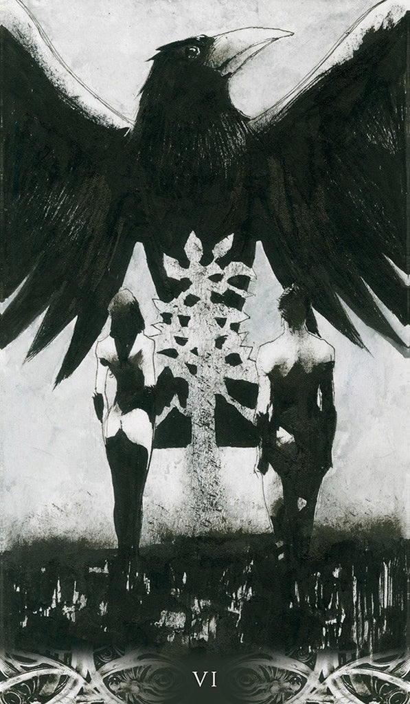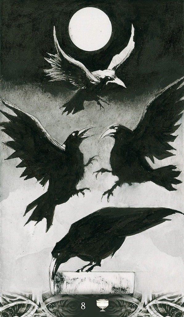 "Ворона приходит последней." Приносящий предзнаменования, посланник, страж и падальщик: у вороны нет хозяина. Черные карты с оттенком красного цвета крови — эта готическая колода приносит Таро страх и тревогу, как никогда раньше. Колода Таро для чтения со своей душой. Работа Коррадо Роя.