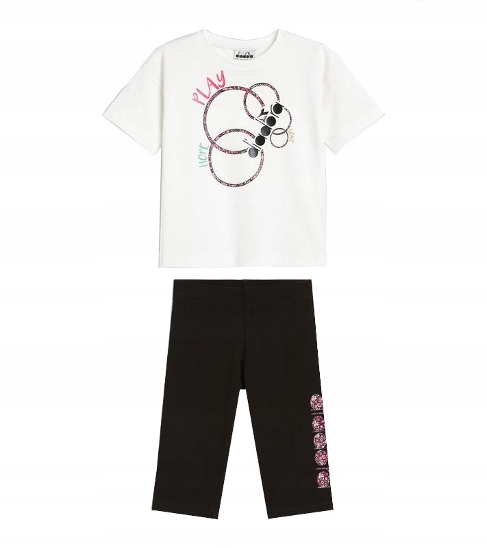 Детский костюм Diadora JG. Fregio Junior Set – футболка обычного кроя с короткими рукавами и круглым вырезом, леггинсы до колен. Комплект для девочки из легкого и воздушного хлопка идеален для занятий спортом и тренировок.