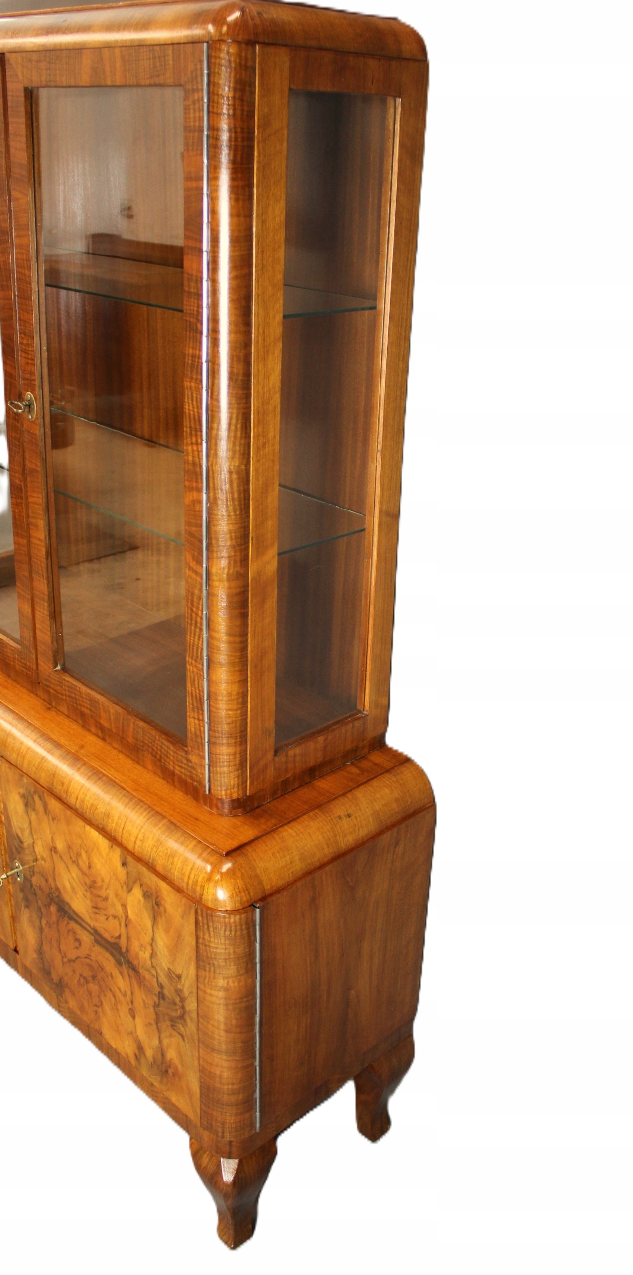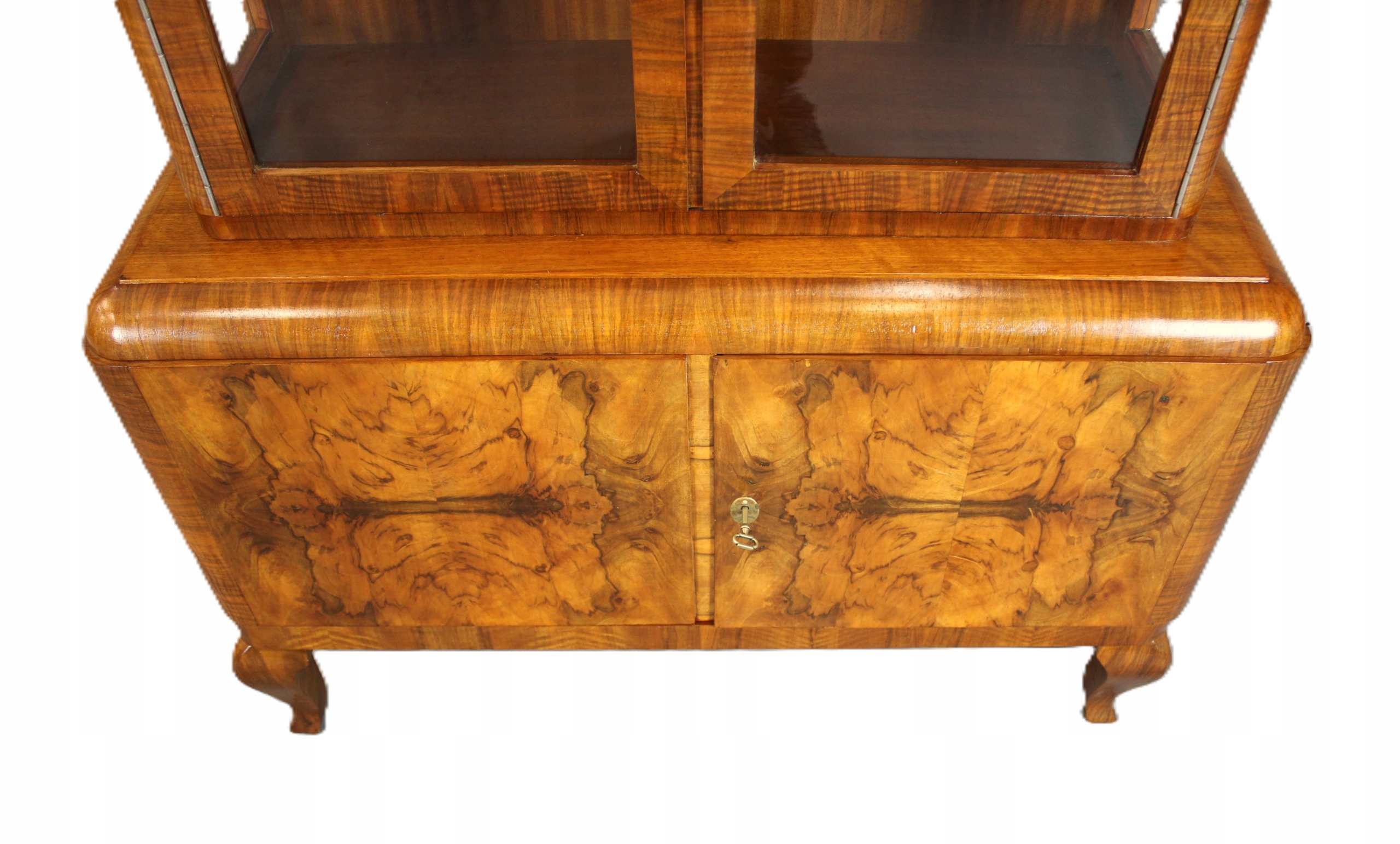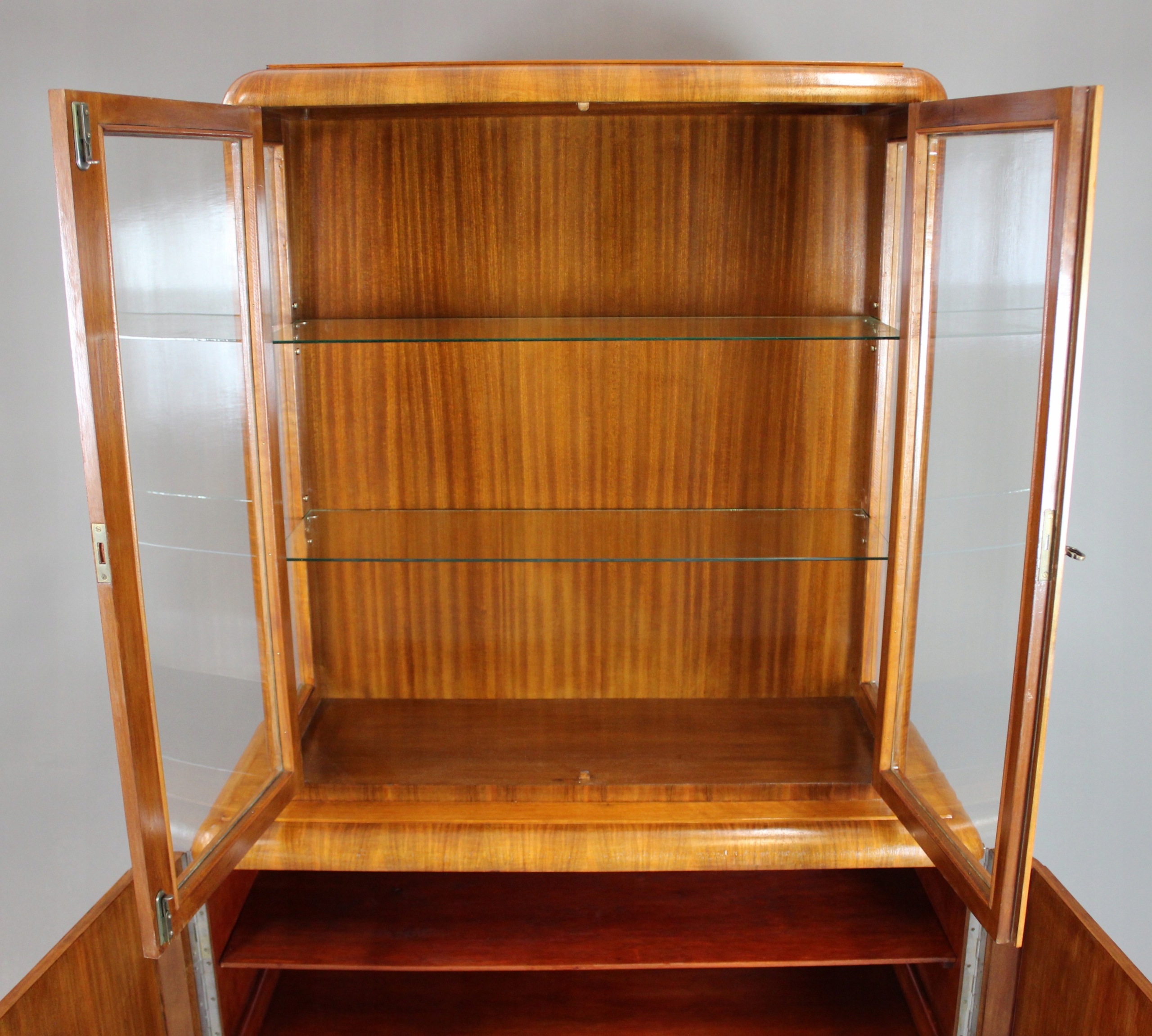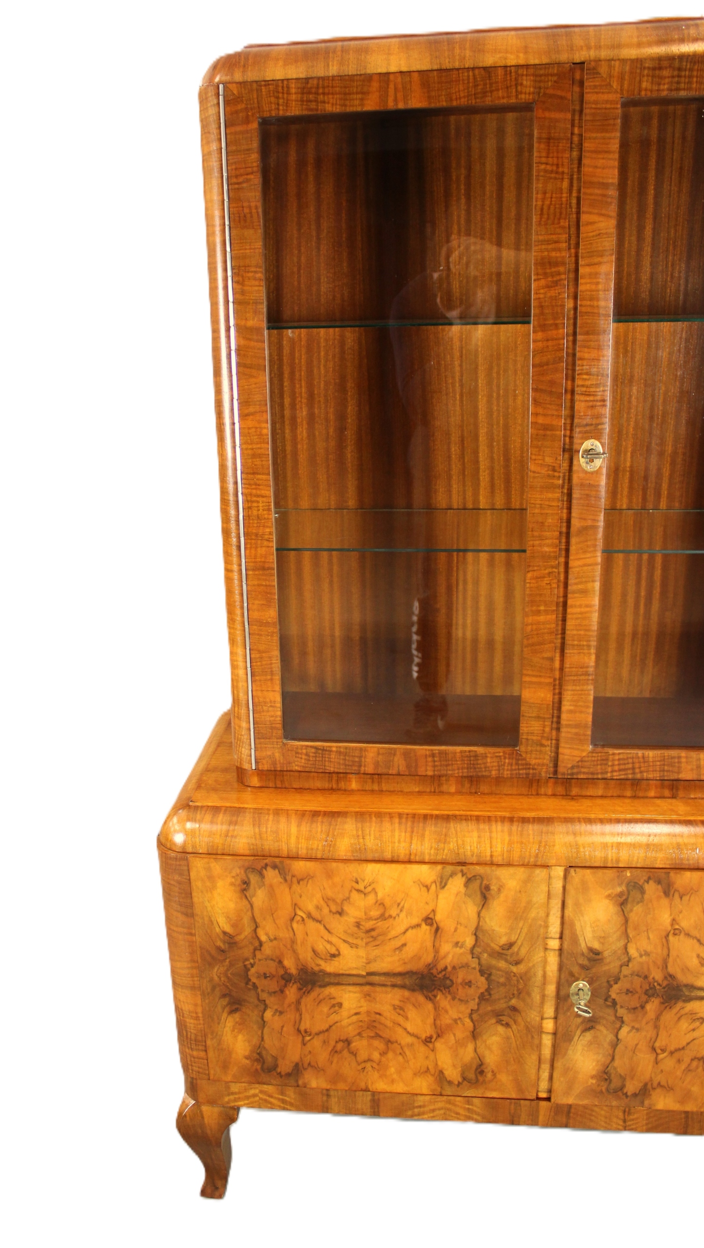 Sergantka / Witryna Art - Деко с 40 -х - 50 после тщательного обслуживания. Мебель, разработанная в очень узорчатом европейском орехе. Все, что закончено с лаком Shellac, нанесенной вручную на полу -маме /полу -корпусе.