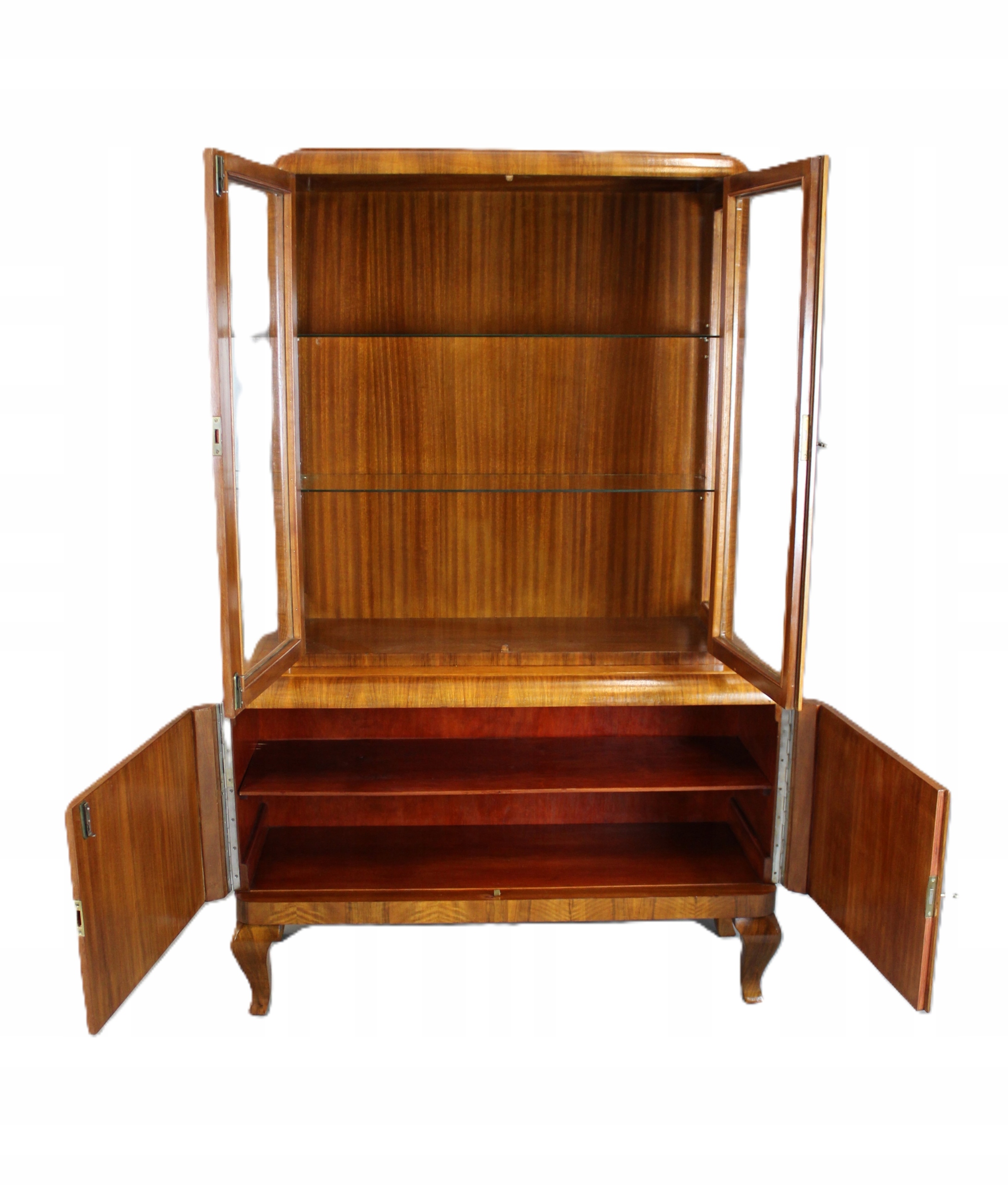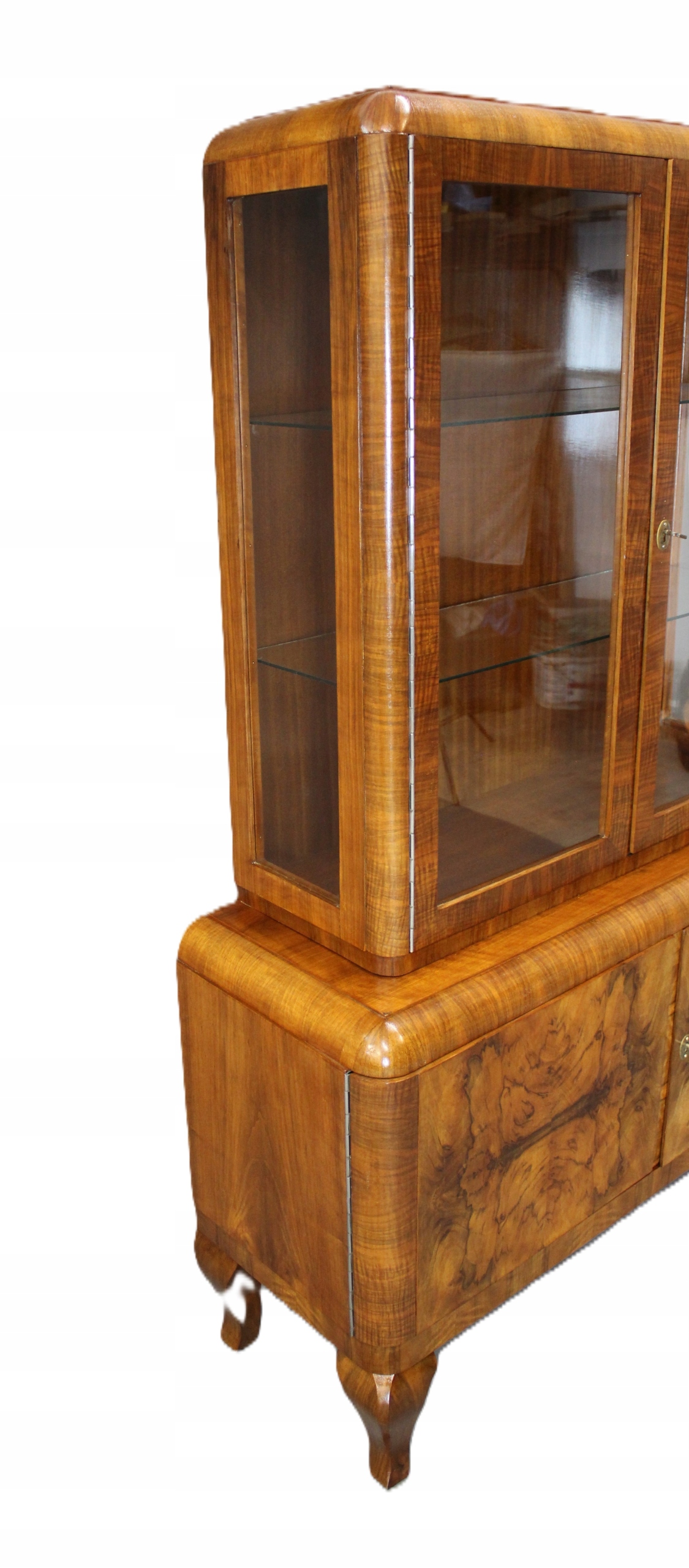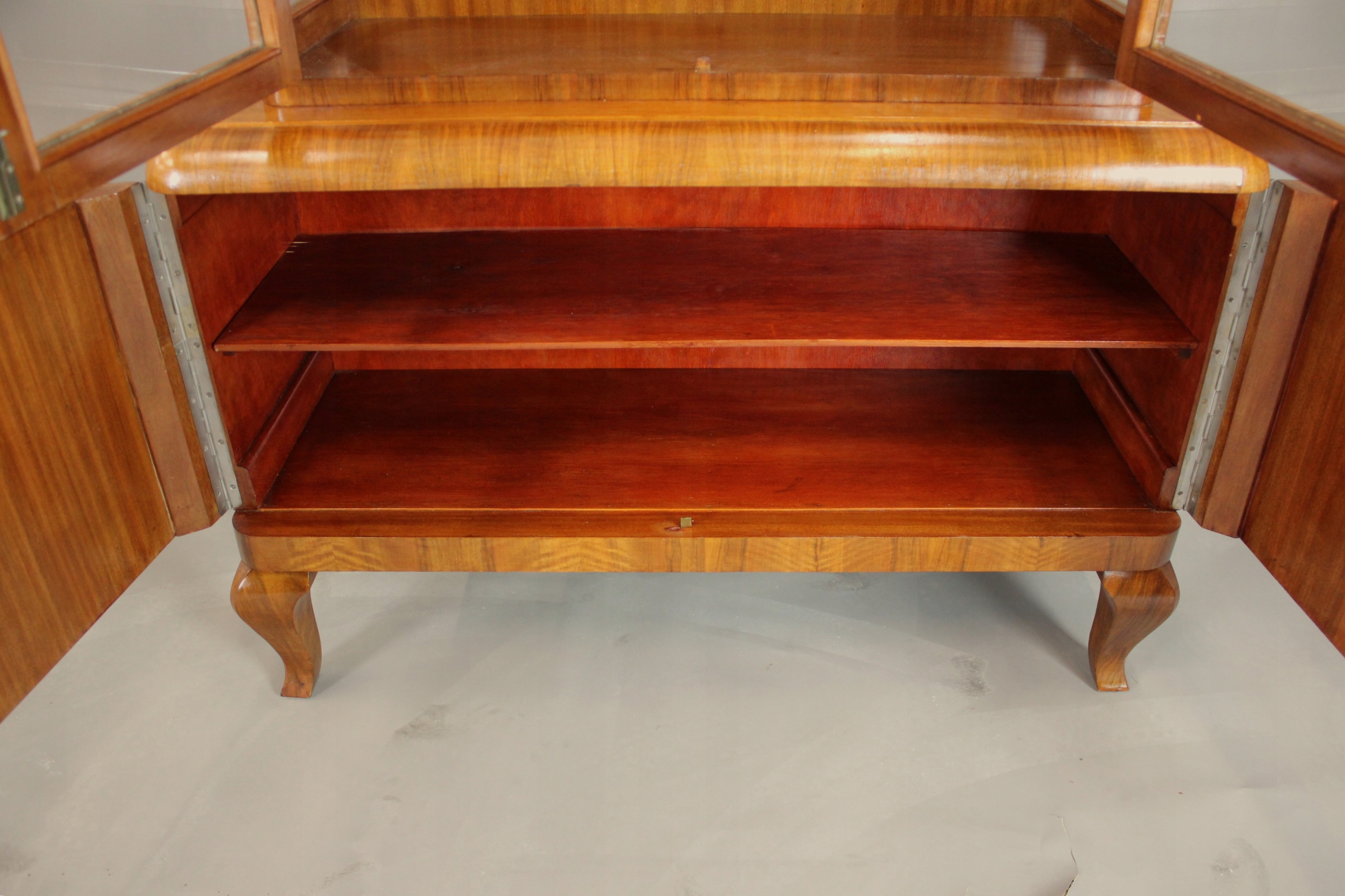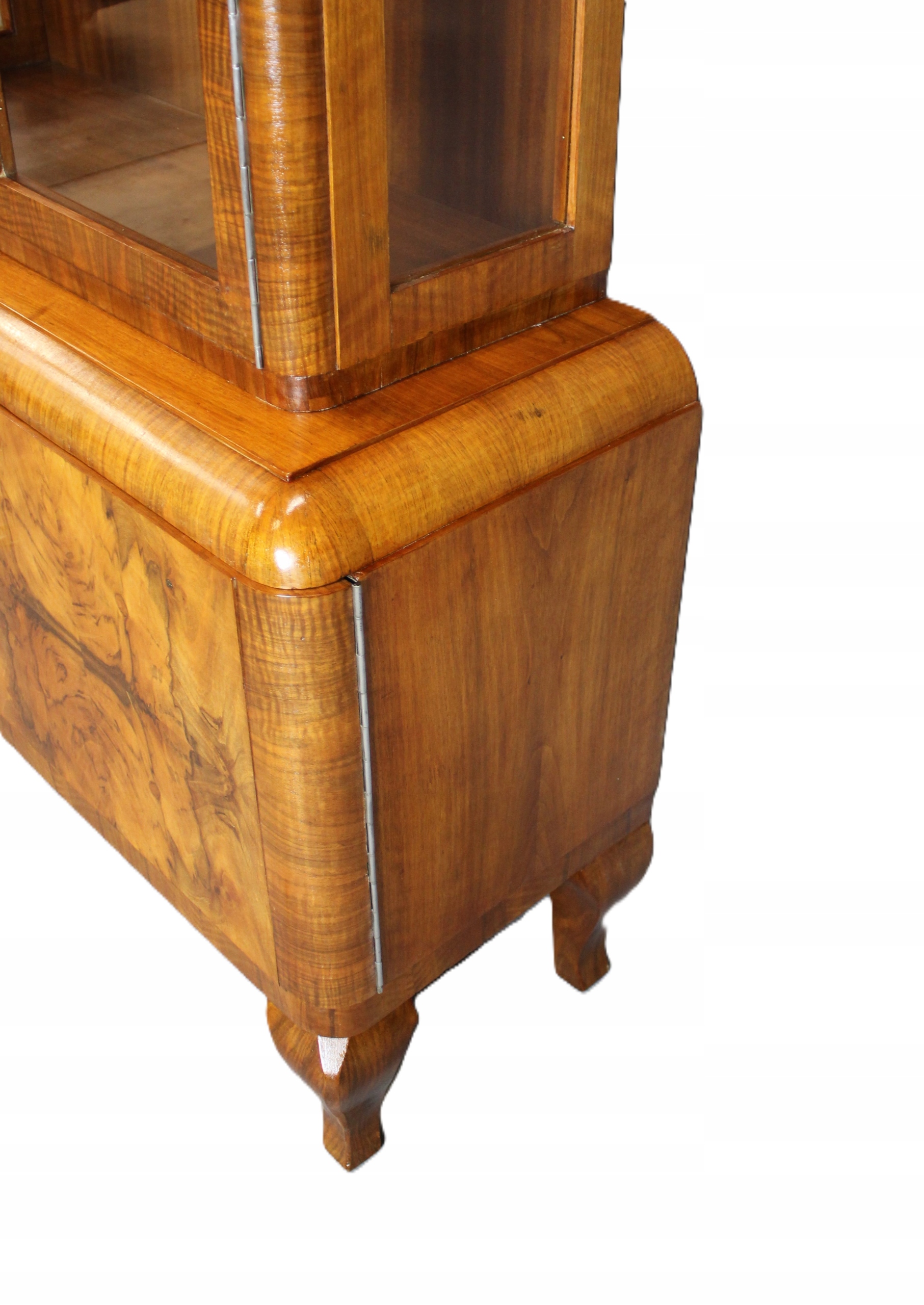 Sergantka / Witryna Art - Деко с 40 -х - 50 после тщательного обслуживания. Мебель, разработанная в очень узорчатом европейском орехе. Все, что закончено с лаком Shellac, нанесенной вручную на полу -маме /полу -корпусе.