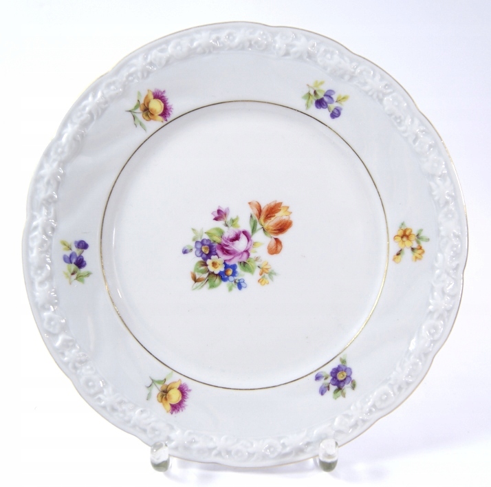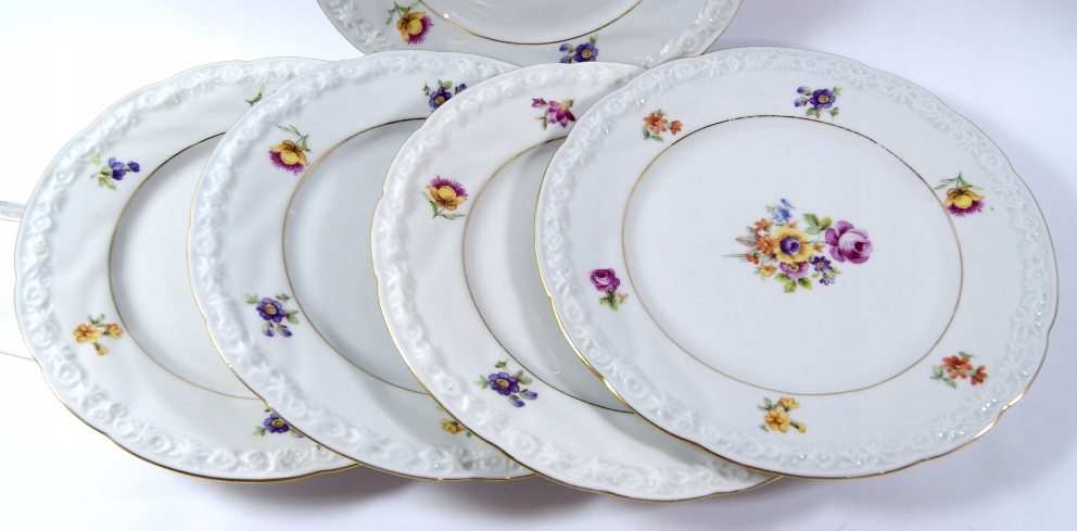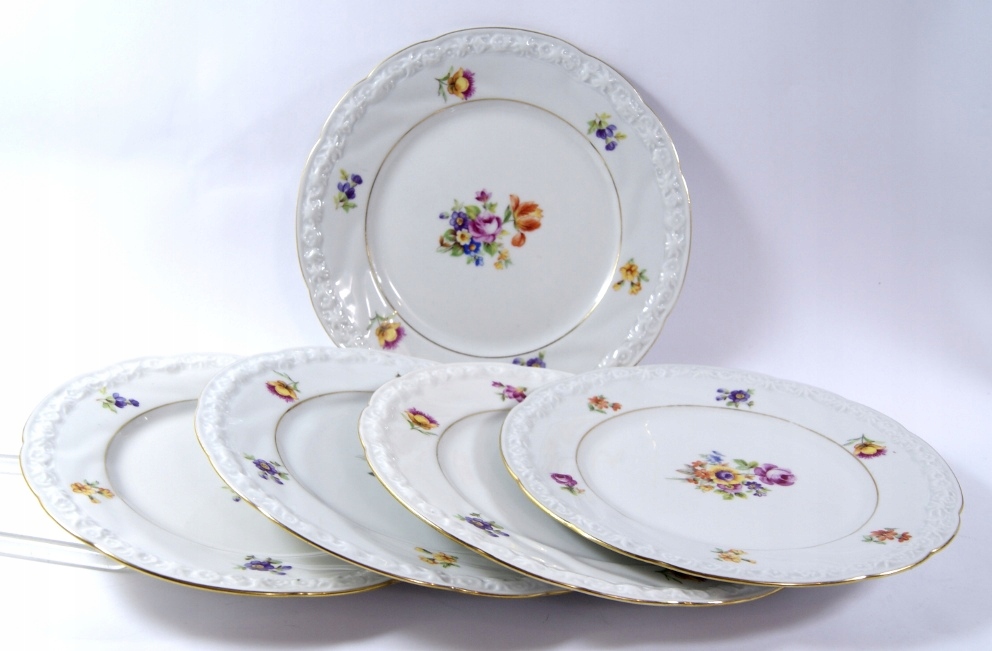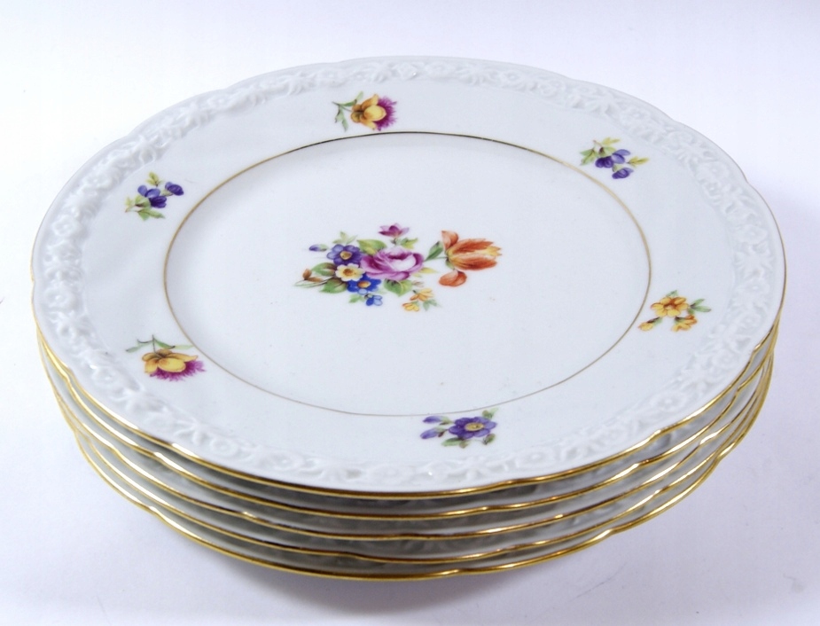Объект аукциона - это красивый, старый набор 5 десертных пластин , изготовленный из белого (белого) фарфора, украшенного цветами, облегчением и позолочкой. Фарфор отличного качества и бренда.