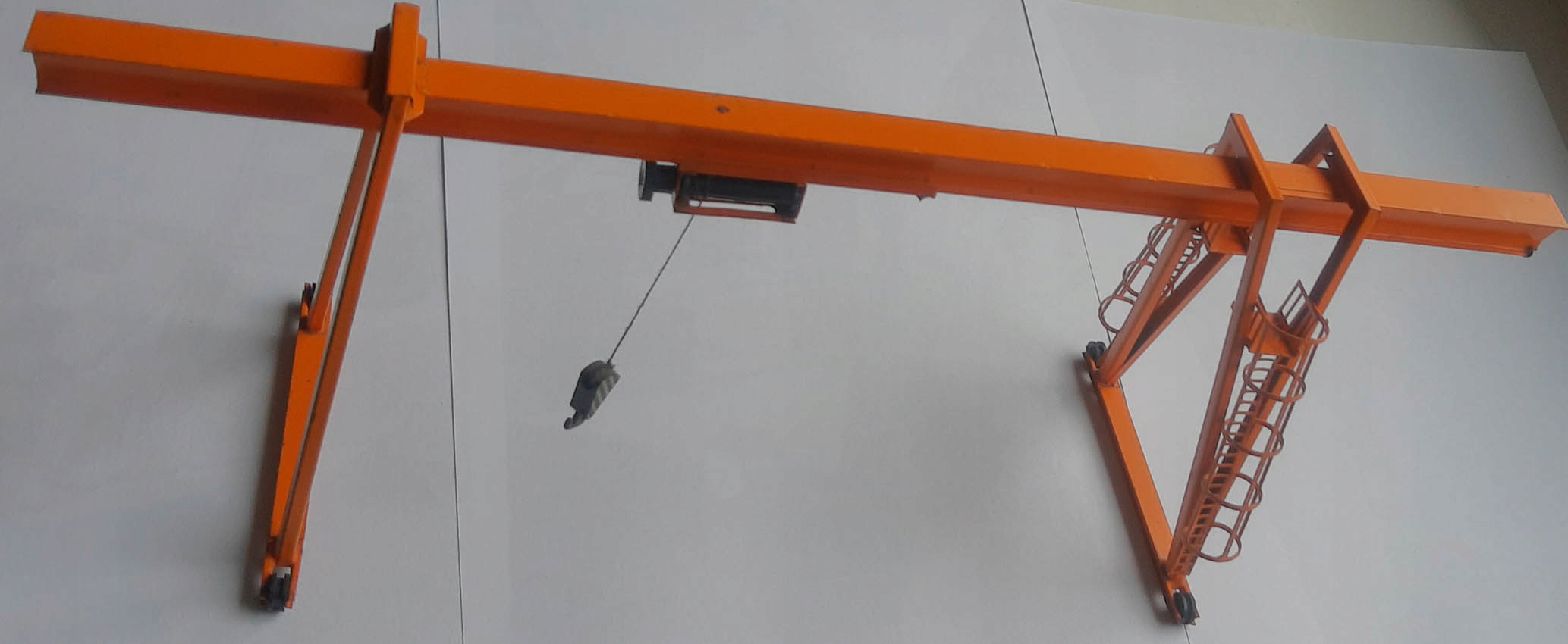 Времён ГДР - компания ВЭБ Пластикарт - козловой кран, универсальная шкала Н0/ТТ - вот список "промахов и повреждений": множество потертостей краски и видимые точечные ямки ржавчины, одна из опор слегка погнута из-за плохого прилегания места пайки опоры к перекладине, отсутствия кабины оператора, которая должна располагаться рядом с катушкой с тросом и крюком, отсутствия обеих одинарных направляющих, по которым должны двигаться колеса - Я по-прежнему рекомендую его, поскольку найти его сегодня непросто.