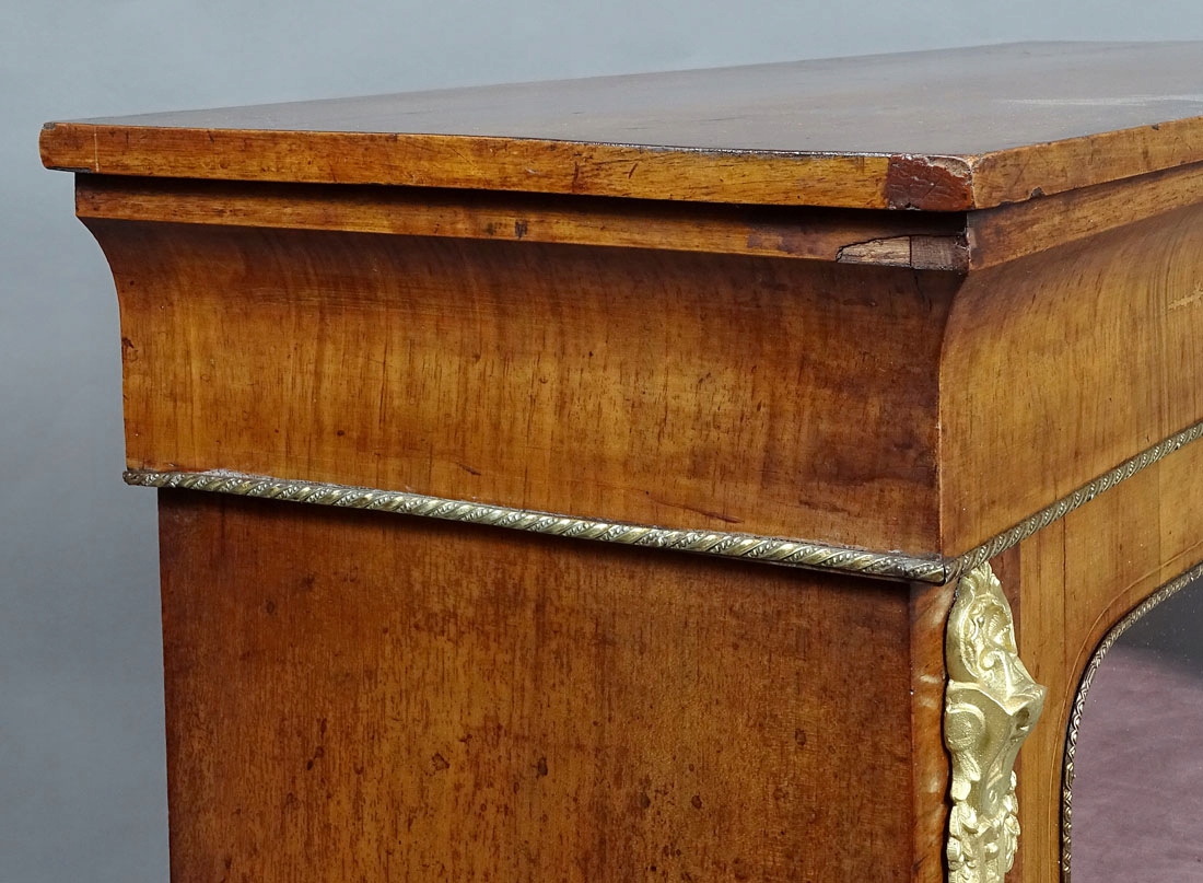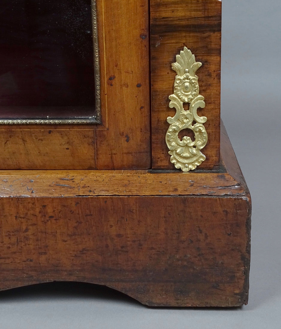 с прямыми линиями рамы, закрытая одной створкой стеклянной двери, поддерживаемой широкой, слегка волнистой спереди полосой. Верх слегка выступает за контур мебели, а под ним находится широкая вогнутая часть, окруженная латунной гравированной полосой, точно так же, как стекло в двери. По бокам, снизу и сверху, как и ключ, имеются латунные ажурные аппликации. На лицевых планках с обеих сторон и под столешницей – изящные вставки с узорами рокайль. Внутри две полки, обшитые тканью, как и задняя часть мебели.На дверце замок с ключом.