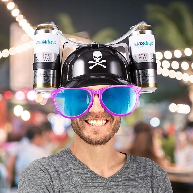 - Две банки ручки - удобное крепление с обеих сторон шляпы позволяет разместить ваши любимые напитки Система питьевой трубки - позволяет одновременно пить из двух банок без необходимости в руках. Партийное безумие