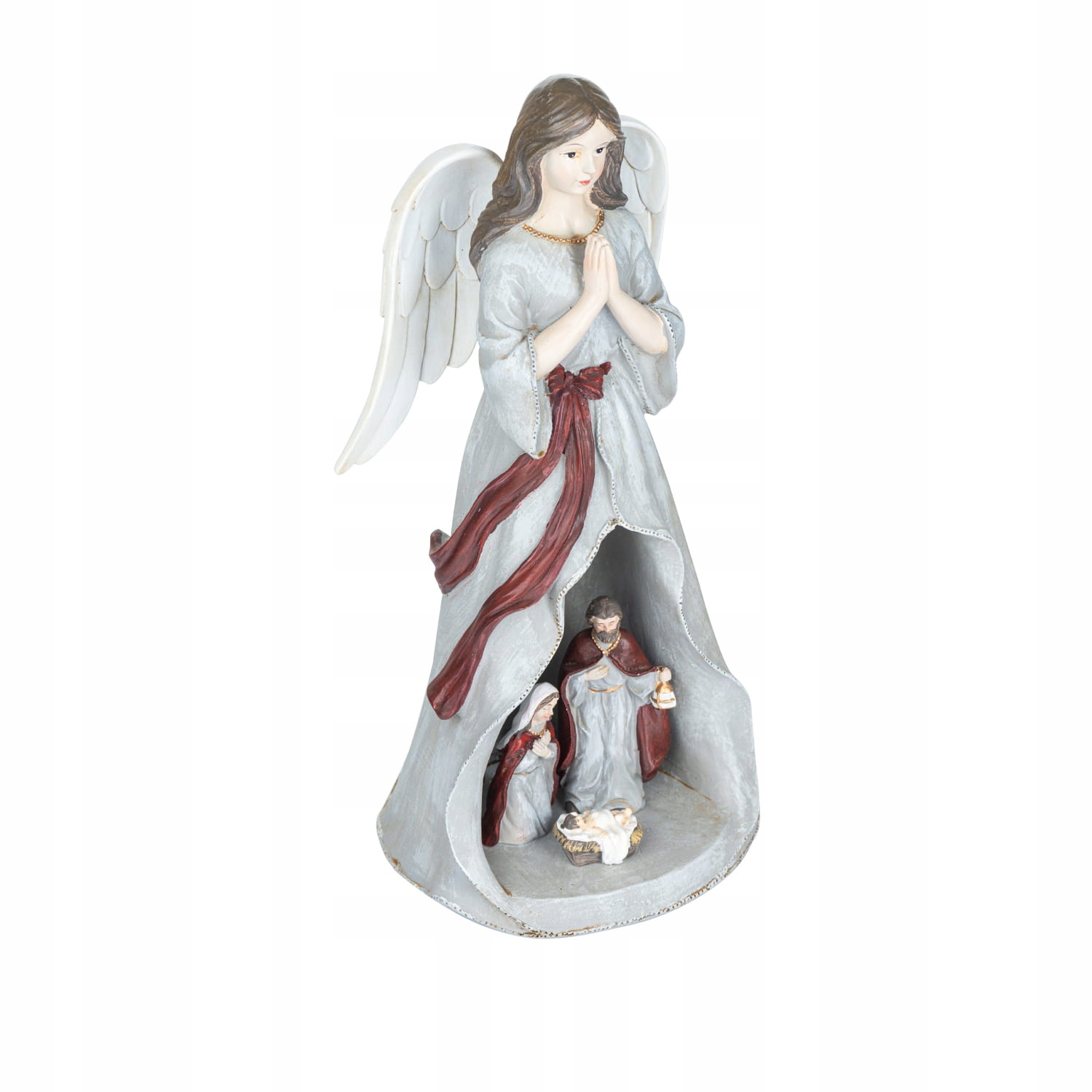 На фигурке изображен ангел со святым семейством. Его руки расположены в жесте молитвы. Платье ангела включает в себя персонажи священного семейства, на которых падает светодиодная подсветка . Фигурные цвета хранятся в оттенках серого и бордового.