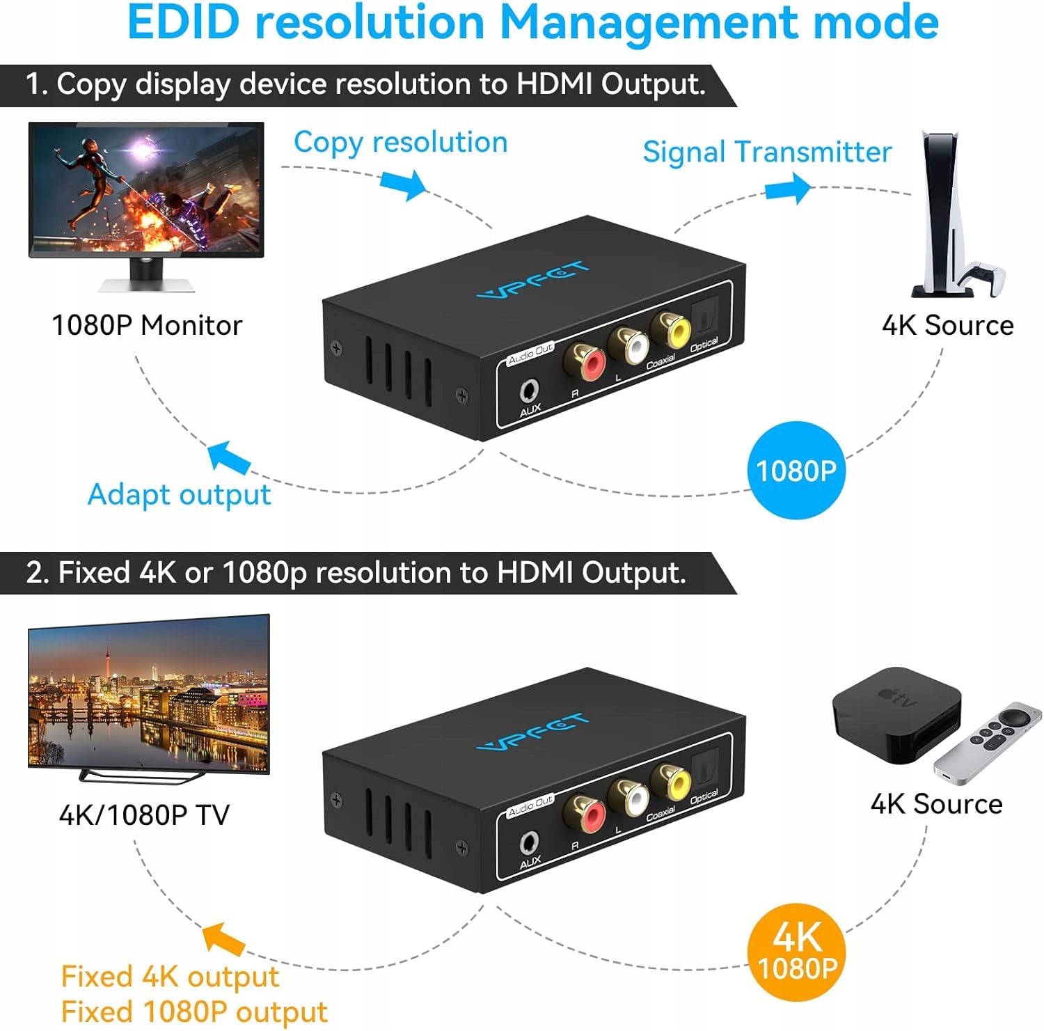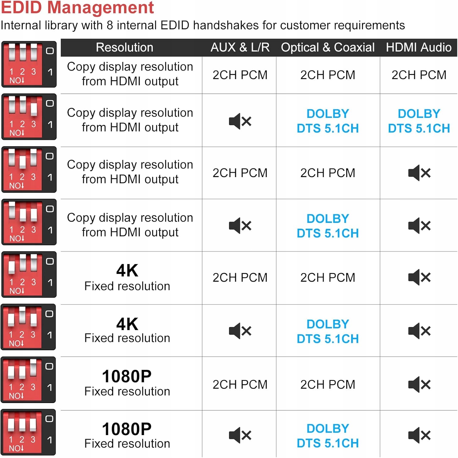 hdmi Audio Extractor Audio Extractor может извлечь звук из сигнала HDMI и отправлять его в AV -приемник с помощью оптического, концентрического кабеля L/R или 3,5 мм. ) Вы можете автоматически пройти через алгоритм, чтобы настроить данные EDID сигнала и источников отображения или использовать встроенные данные EDID, чтобы убедиться, что их можно правильно использовать. Устройство может контролировать, воспроизводится ли звук в HDMI или нет. Качество изображения HDCP1.4.4K при 60 Гц (420), 4K при 30 Гц RGB / YUV4: 4 в ультра -высоком разрешении. Оптический и концентрический выход поддерживает Dolby DTS 5.1. Выход 3,5 мм и поддержка L/R PCM2.0. Аудио -преобразователь HDMI не требует внешнего питания при подключении к большинству исходных устройств