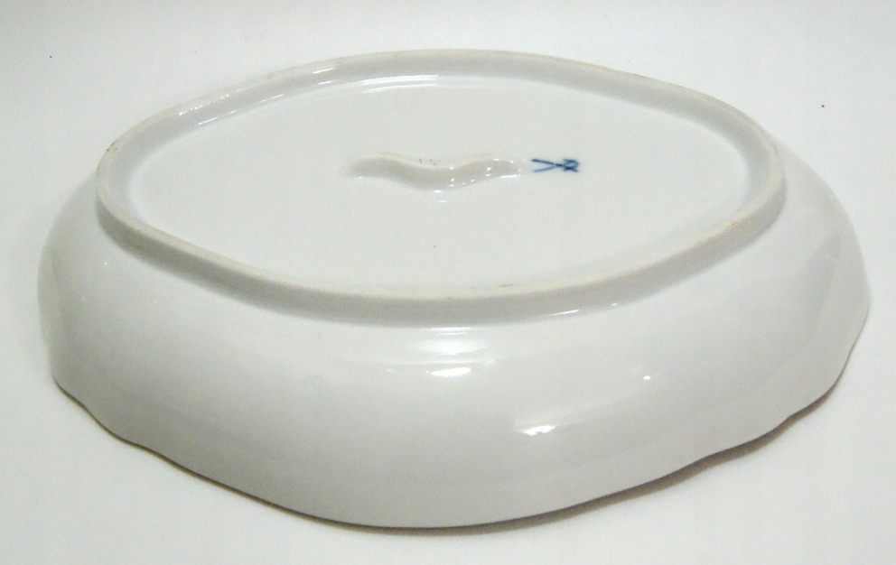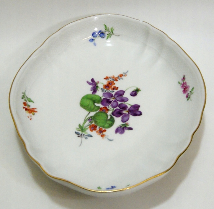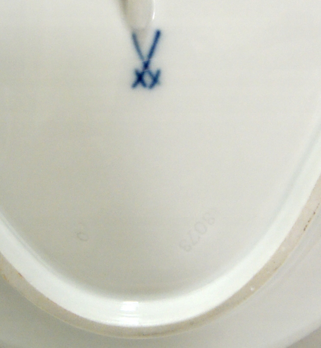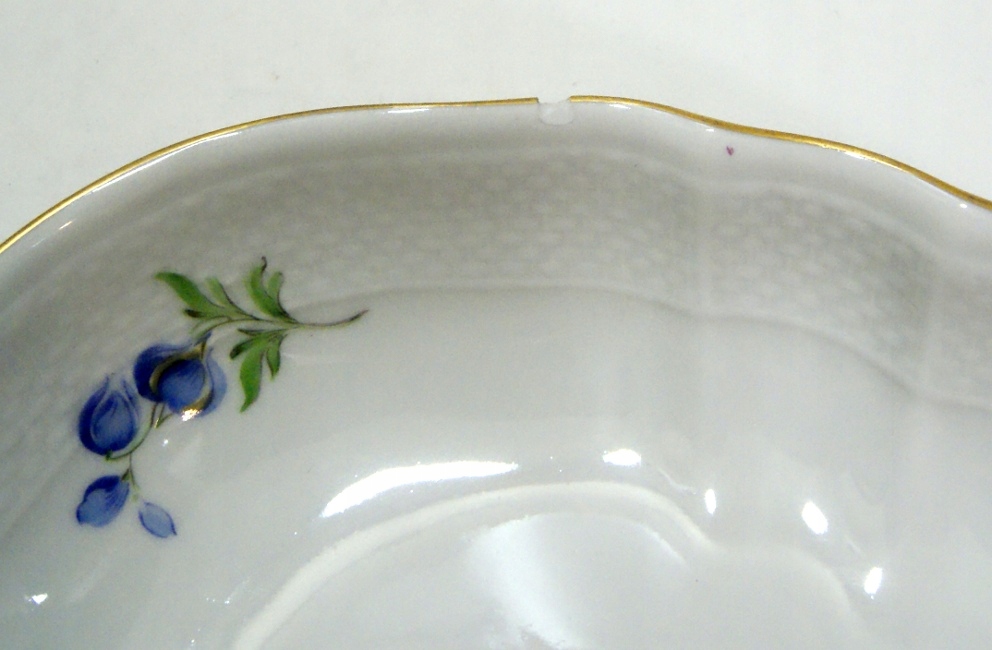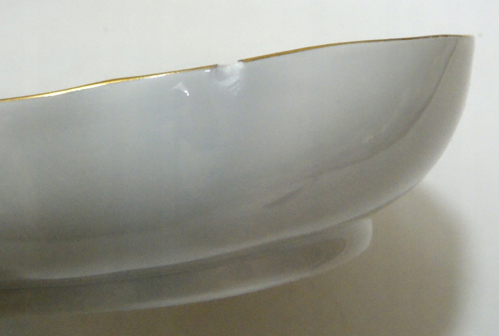Предмет аукциона – красивая старинная тарелка из белого фарфора, украшенная цветами, позолотой и рельефом. Состояние тарелки было бы очень хорошим, если бы не небольшой скол по краю, ни одной трещины. Ниже фото чипа, показанное с обеих сторон края при большом увеличении.