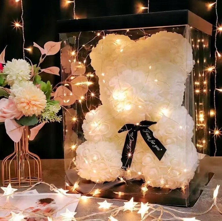 - В комплект входят: мишка, коробка. b> , запас 3 шт. роз, гирлянда с светодиодной подсветкой на батарейках (теплый цвет)