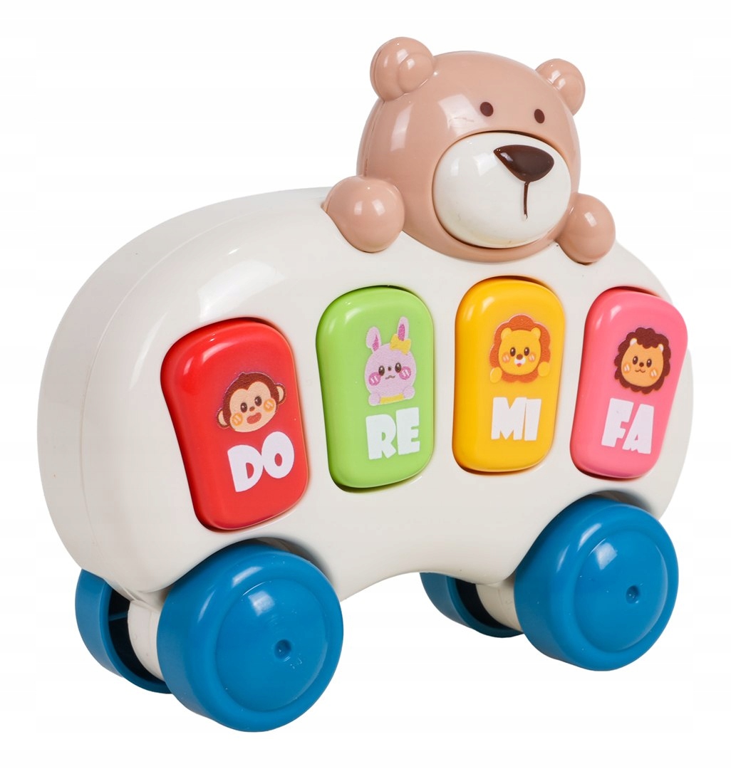 Пианино с мишкой и колесиками для детей от восемнадцати месяцев. Фортепиано изготовлено из материалов высочайшего качества, ярких цветов и не имеет острых концов. Пианино напоминает игрушечную машинку с мишкой и имеет четыре звуковые клавиши с рисунками животных и подсветкой. Нажатие клавиши активирует режим фортепиано (звуки нот, подсветка клавиш). Нажатие одной и той же клавиши дважды вызовет звуки животного. Нажатие на плюшевого мишку вверху активирует веселые мелодии. Игрушка работает от 2 батареек ААА 1,5В.