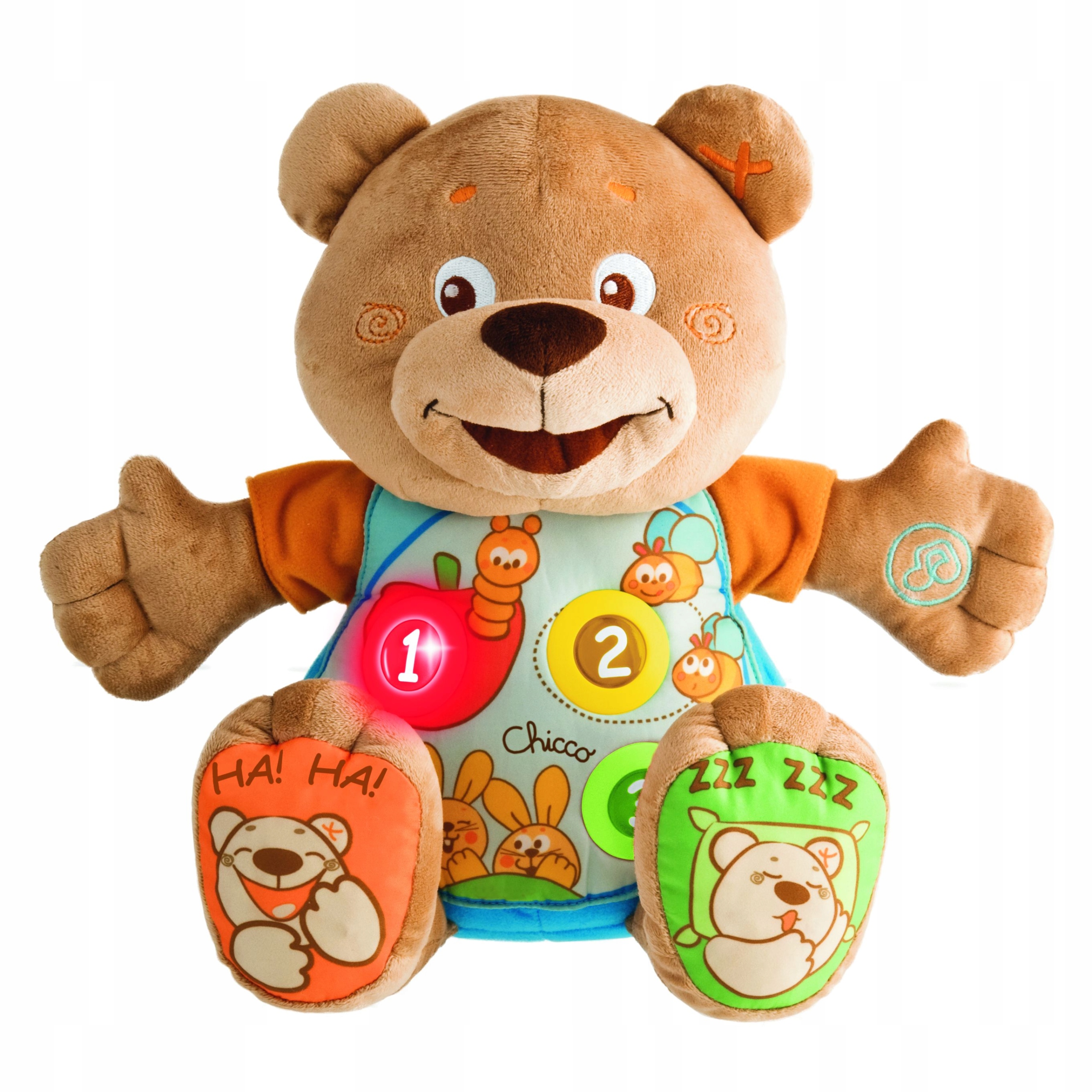 Chicco Teddy Bear Count with Me — это мягкая интерактивная игрушка и новый друг для объятий, а также идеальная двуязычная игрушка, которая поможет вашему ребенку выучить слова и цифры на польском и английском языках. Обучение происходит естественным и спонтанным путем поглощения звуков повторяющихся стишков и поощрения лепетания.