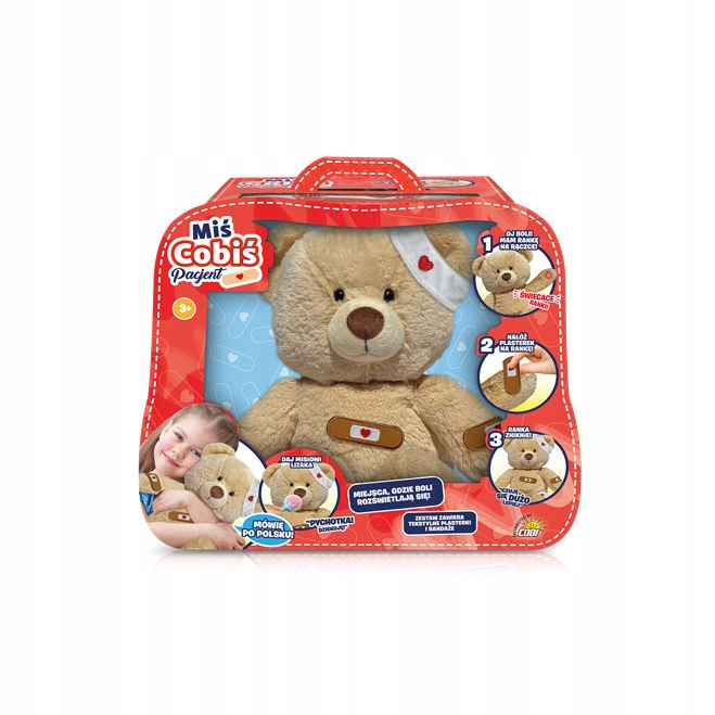 Интерактивный говорящий плюшевый мишка, который плохо себя чувствует. Позаботьтесь о мишке, наложите пластырь или повязку на светящиеся ранки, появившиеся на теле мишки, и он ответит вам взаимностью. Язвы появляются на голове, руке, животе, ноге и ступне. После наложения пластыря или повязки ранки исчезают. Медведь говорит по-польски!