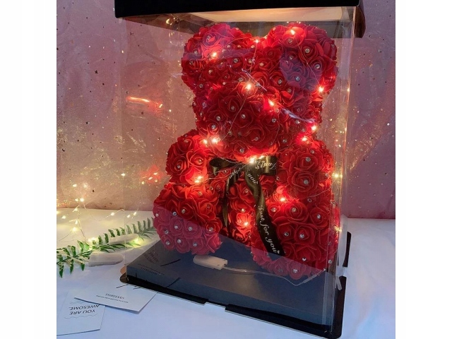 Предлагаемый предмет состоит примерно из 600 пенопластовых роз, которые расположены в форме милого плюшевого мишки. В комплект входят светодиодные лампы, которые еще больше подчеркнут мишку и сделают подарок еще оригинальнее. Благодаря тому, что розы никогда не завянут, композиция долгое время будет служить прекрасным украшением.