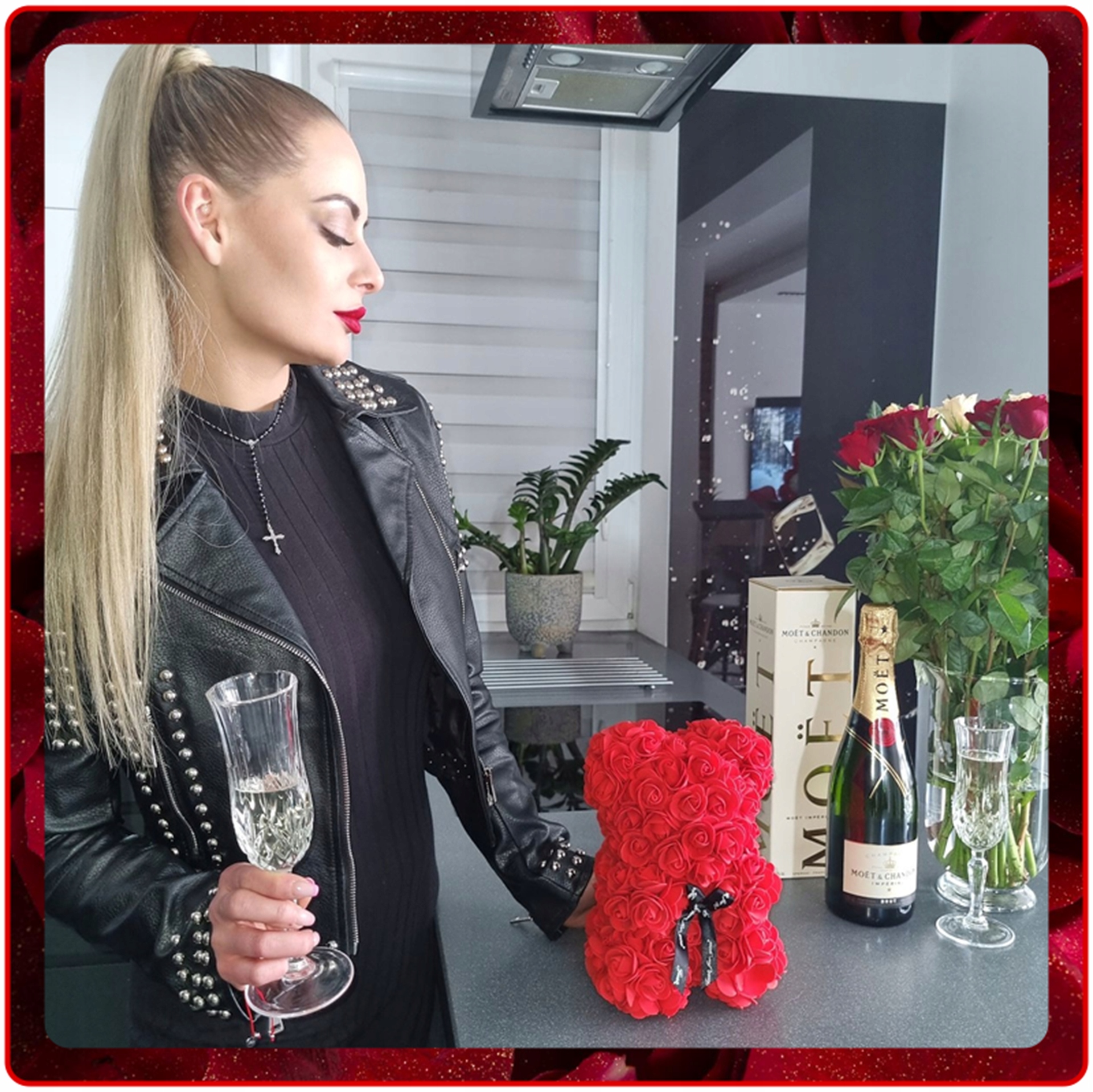 Медвежонка можно накрыть, например, плюшевым мишкой. лепестки роз перед тем, как закрыть крышку. Представьте себе лицо любимой во время помолвки или романтического юбилея, когда она поднимает прозрачную крышку, вокруг разлетаются лепестки цветов, и среди них появляется милый мишка из сотен роз. Сцена, достойная лучших романтических фильмов.