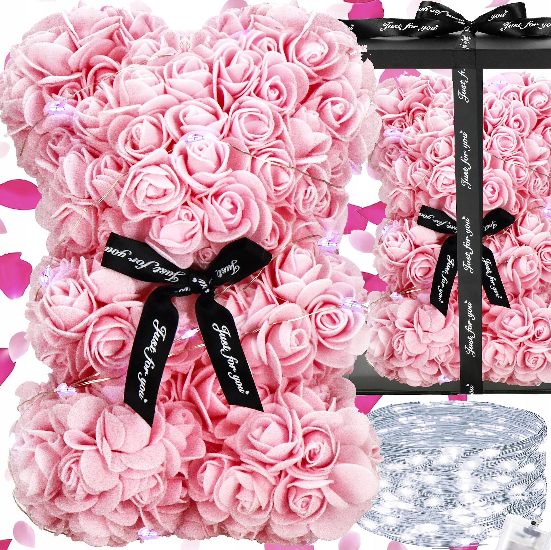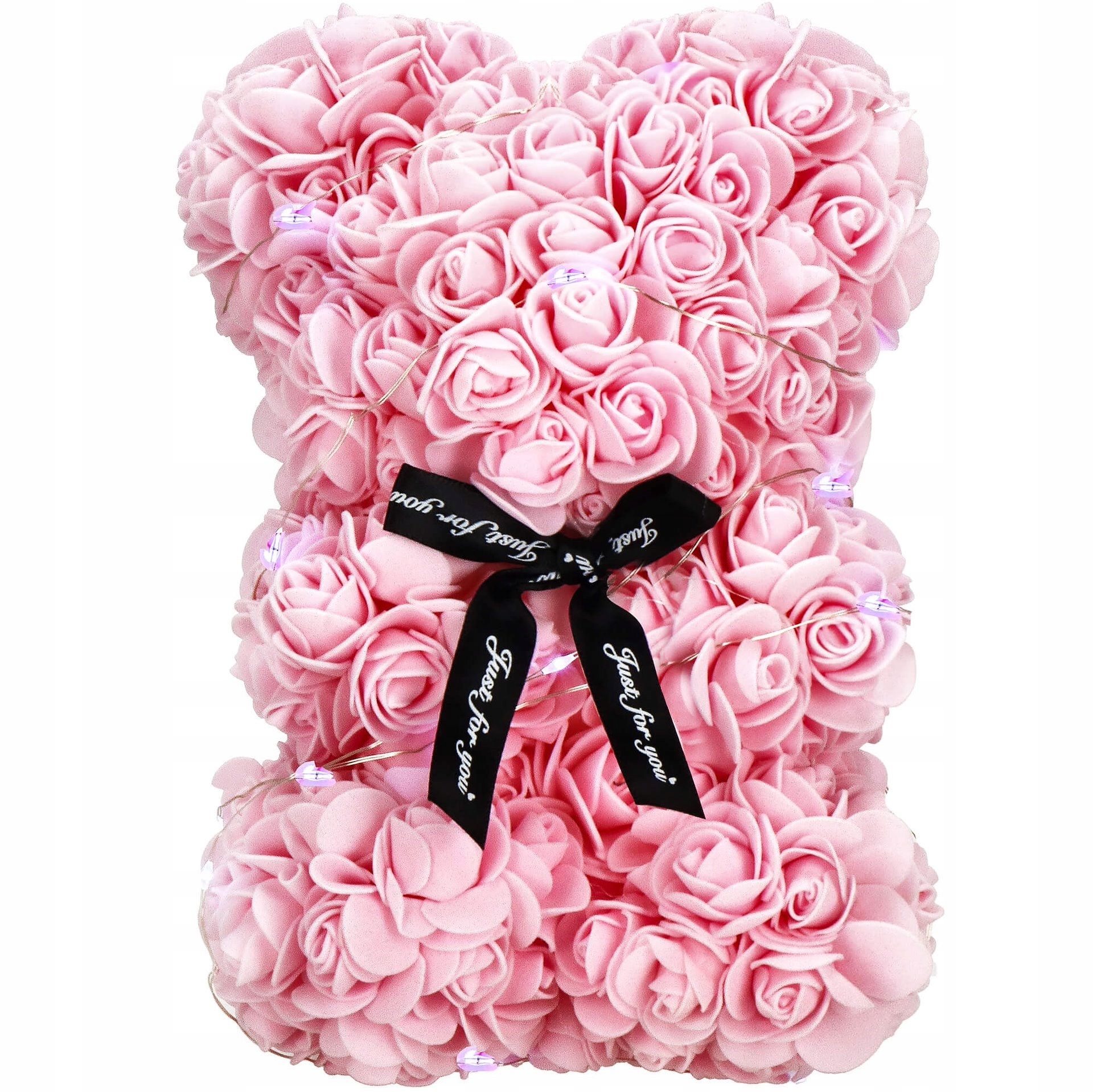 МИШКА С РОЗАМИ 30 СМ МИШКА С ЛЕПЕСТКАМИ РОЗ БАНТ ПОДАРОЧНАЯ КОРОБКА+20LED