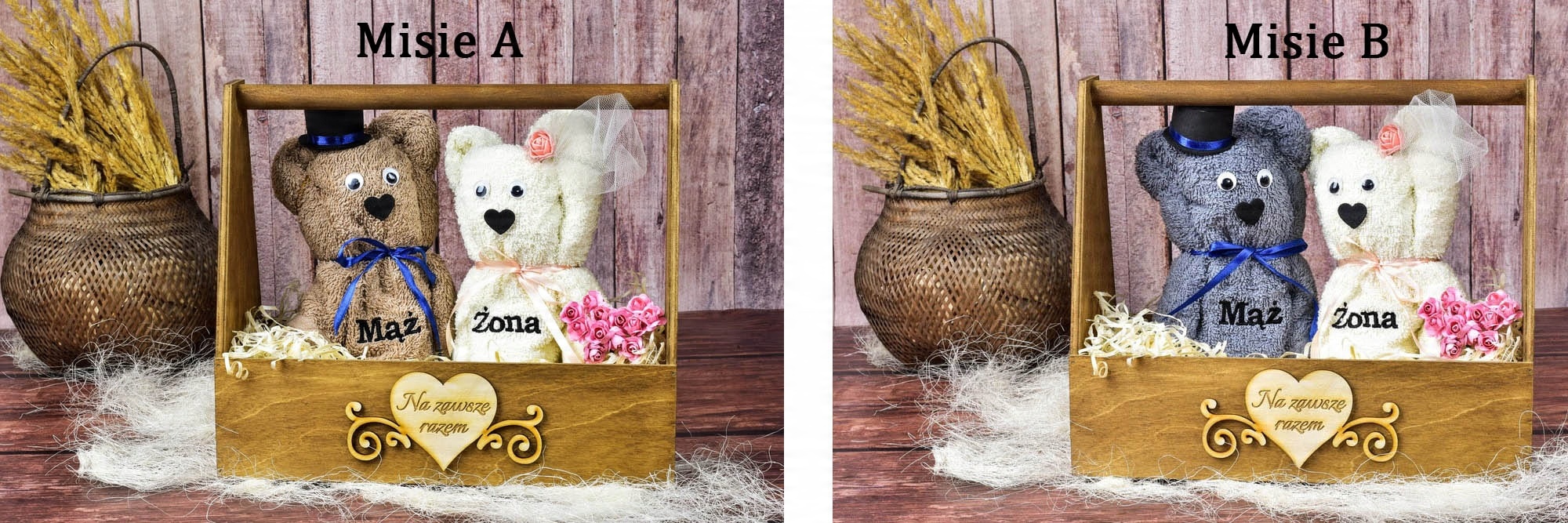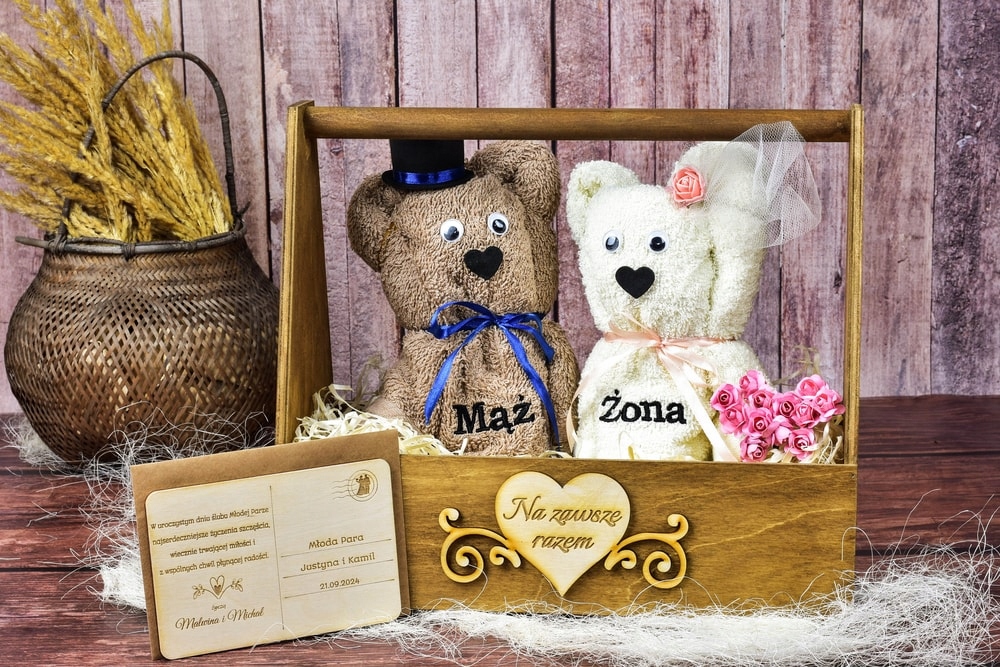 Магазин «Деко Тракт» представляет оригинальный и изысканный подарок жениху и невесте, состоящий из деревянной переноски в деревенском стиле с двумя вышитыми полотенцами, расположенными в форме плюшевого мишки и именным сердечком спереди. h2>