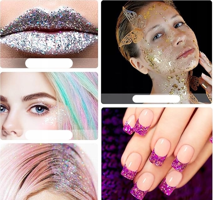 Широкое применение: блестящие блестки не повреждают тело или кожу и легко чистятся. Идеально подходит для украшения тела, глаз, губ и волос. Особенно рекомендуется для вечеринок, свадеб, шоу, сцен, баров и т. д.