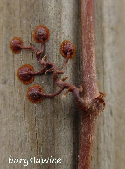 Слева на фото видно присоски, благодаря которым виноградная лоза очень хорошо цепляется за стены, заборы и даже стекло.
