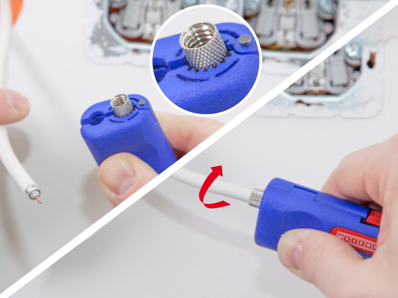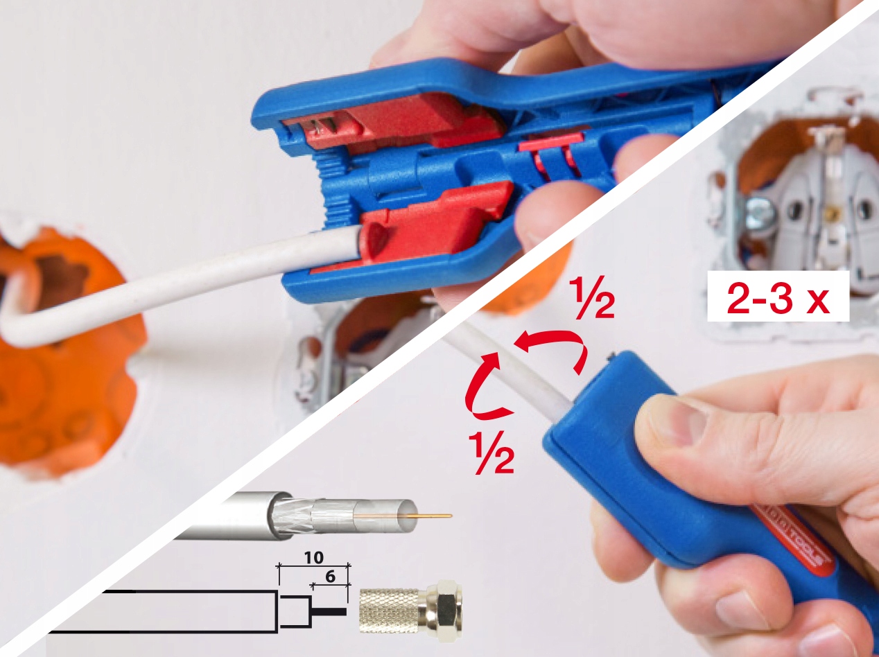 Удобный инструмент для монтажа и разборки разъемов типа F с интегрированным открытым шестигранником SW 11 мм. Истотные челюсти для обмотки разъемов FH по кабелю. Обменные модули в «щелчке».