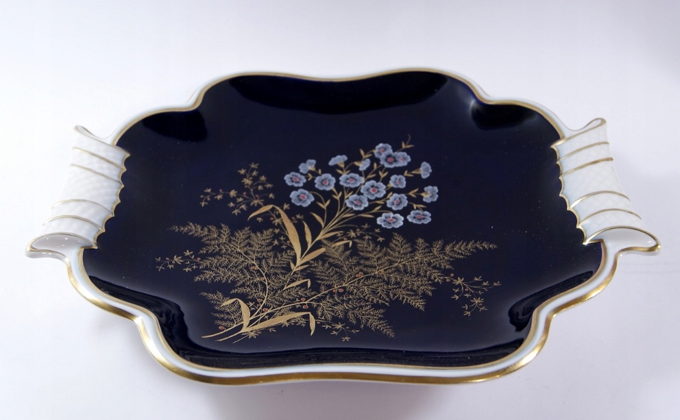 Красивая, старая тарелка сделана из белого фарфорового кобальта. Декор синие золотые цветы и облегчение.