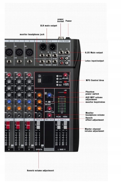 Совместимость микшера с различными устройствами, такими как комбинация микрофона/инструмента, подходящая для семейства KTV, выступления полосы, классы кампуса, конференции и другие случаи. Аудио поддерживает проводное/беспроводное соединение/емкостное микрофон/инструмент, подходящий для домашнего KTV, выступлений группы, мероприятий в кампусе, конференций и других случаев