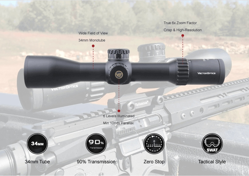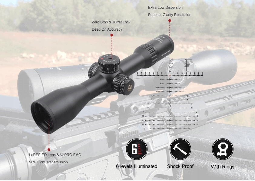 Прицелы VEC MBR, помещенные в первое фокусное расстояние (FFP), обеспечивают постоянные пропорции во всем диапазоне увеличения и высококачественные антирефлексивные покрытия FMC Diamond Clear Vepro минимизируют отражатели, улучшая качество изображения. Телескоп питается аккумулятором CR2032, а вся конструкция обеспечивает исключительное сопротивление удару.