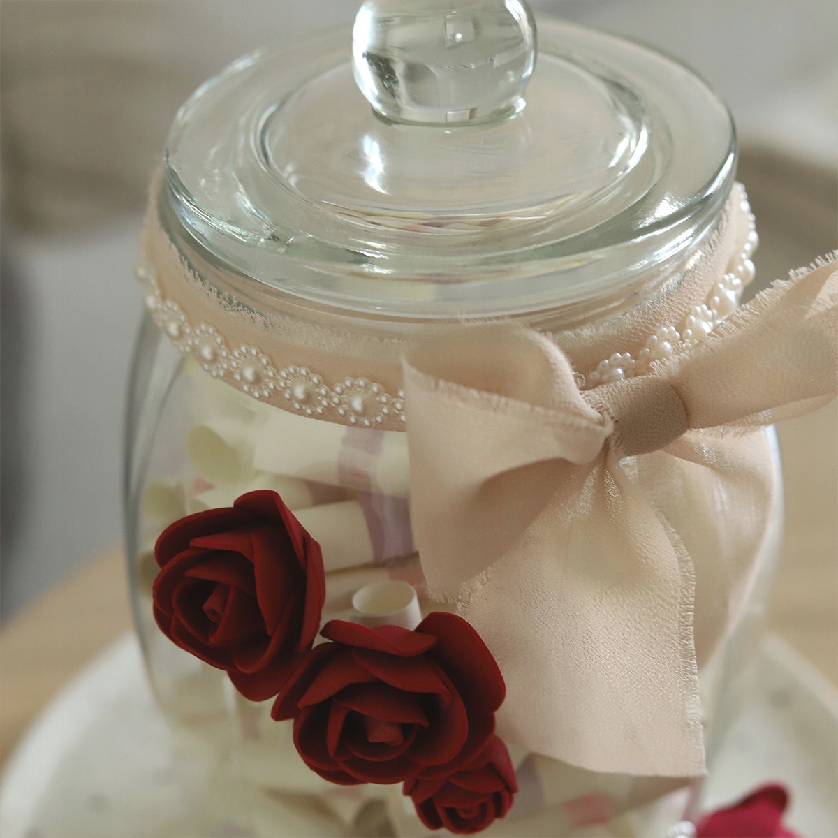 Стеклянная прочная банка с декоративной крышкой, украшенная вручную бордовыми розами, бусинами и нежным бантом пудрово-бежевого оттенка.
