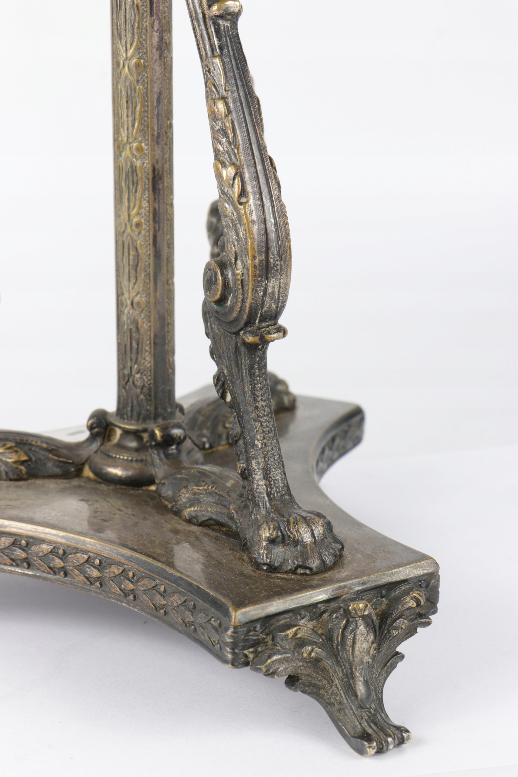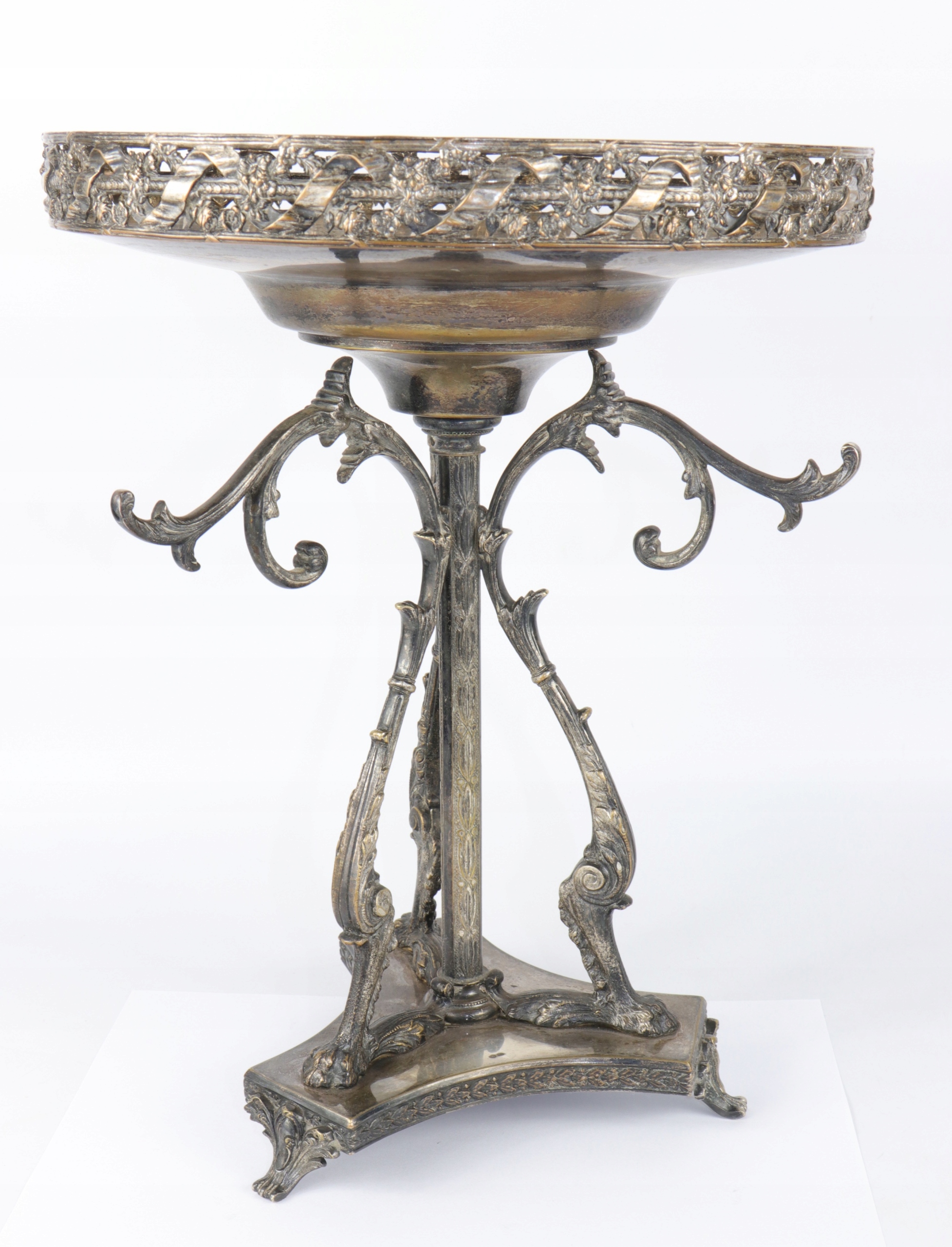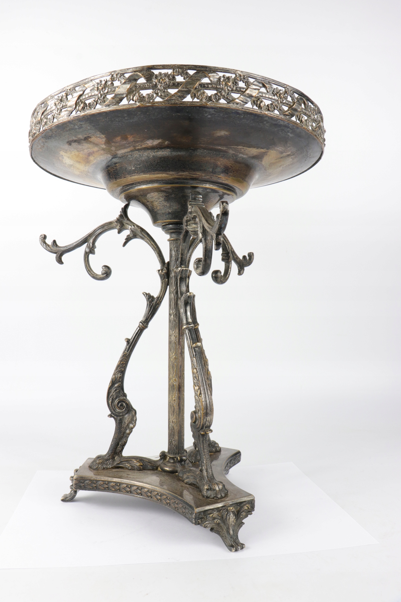 Огромная патера центра стола, украшенная красивым орнаментом. Центральные колонны, окруженные тремя опорами, заканчивались верхним краем львов с очень богатым узором с открытой работой с переплетенными цветами и лентами. Патера основана на одной колонке и три излучающих опорах, встроенных на основе трех ног. Патера в эклектичной форме со второй половины девятнадцатого века.
