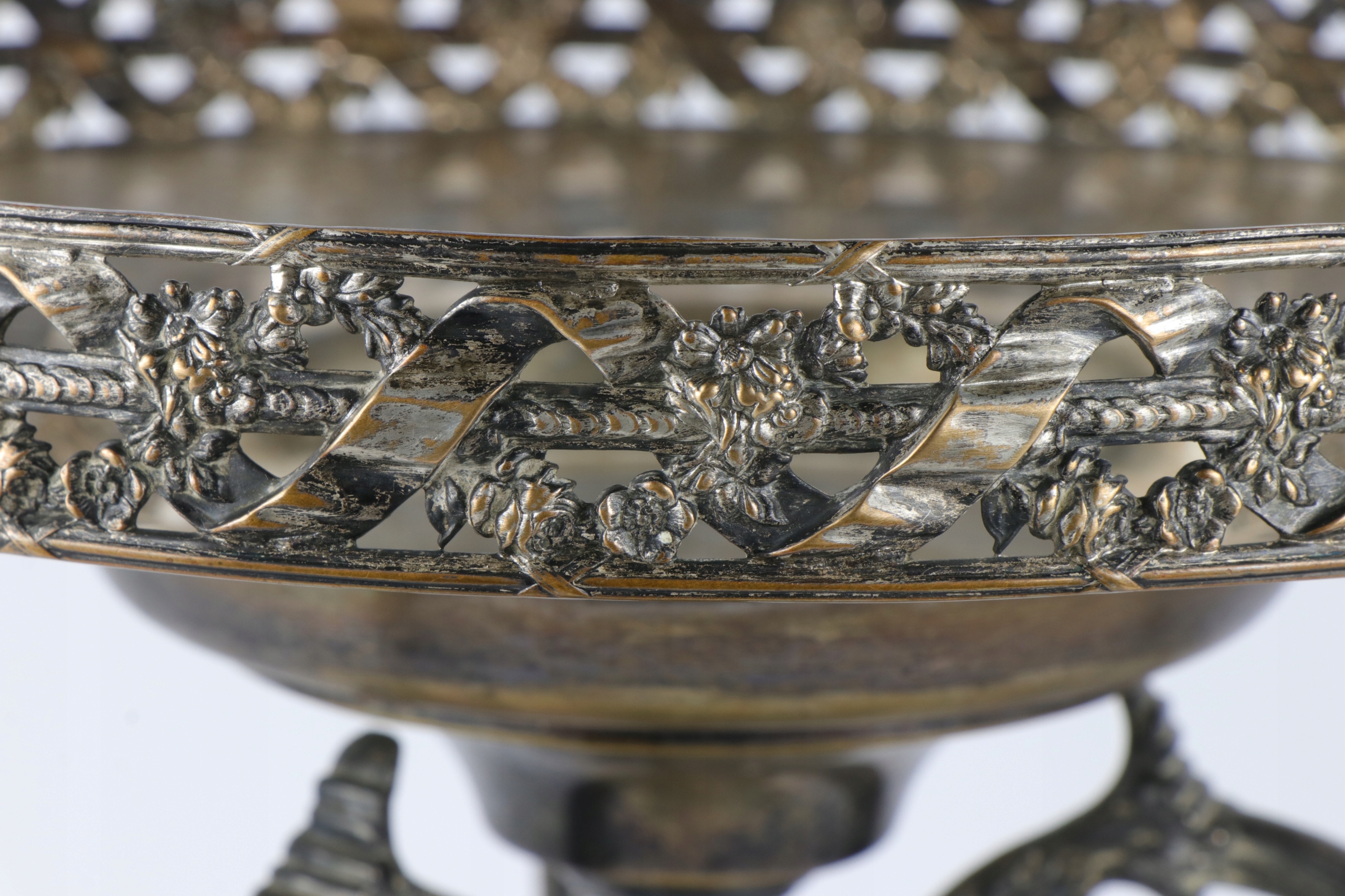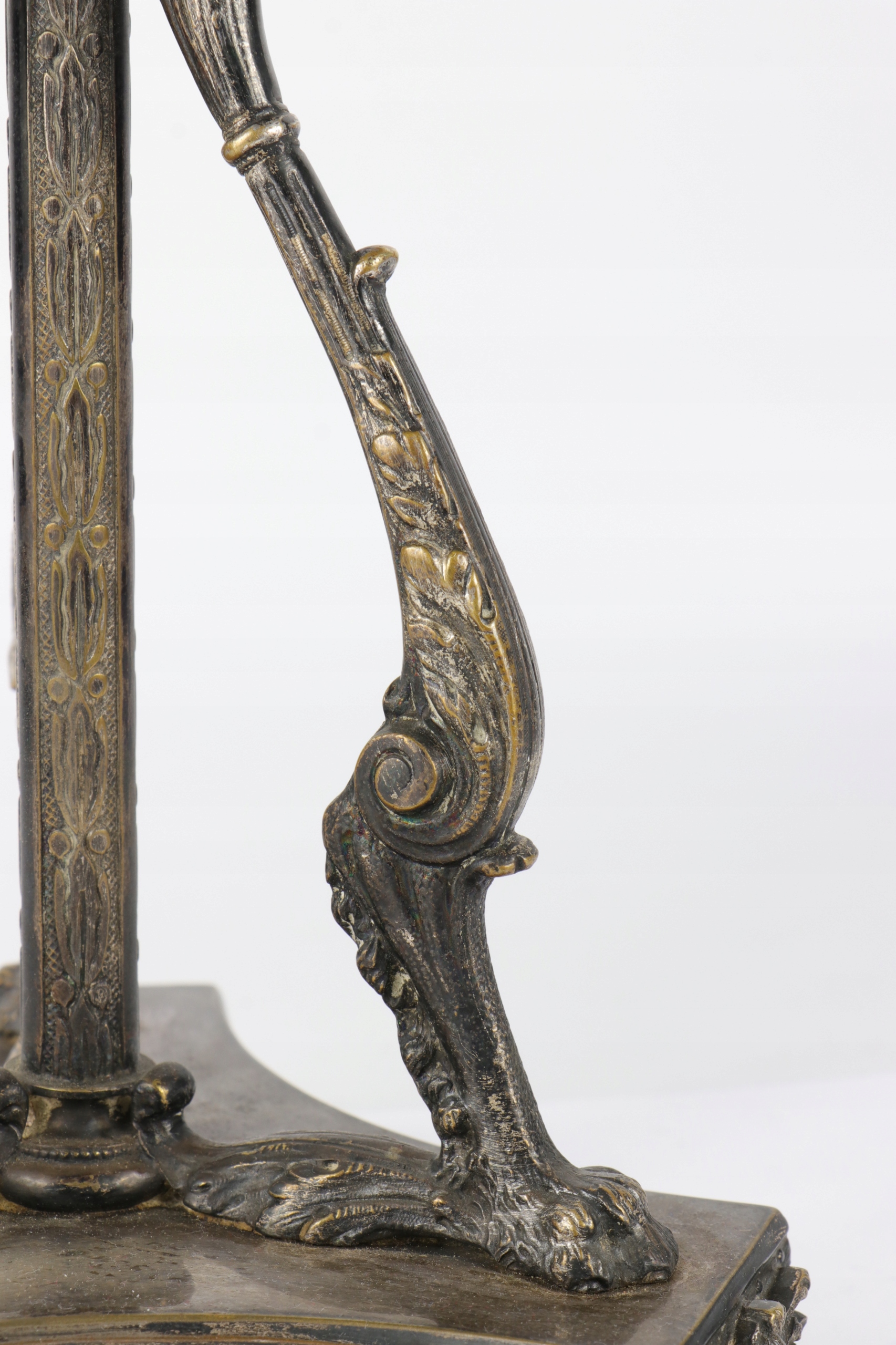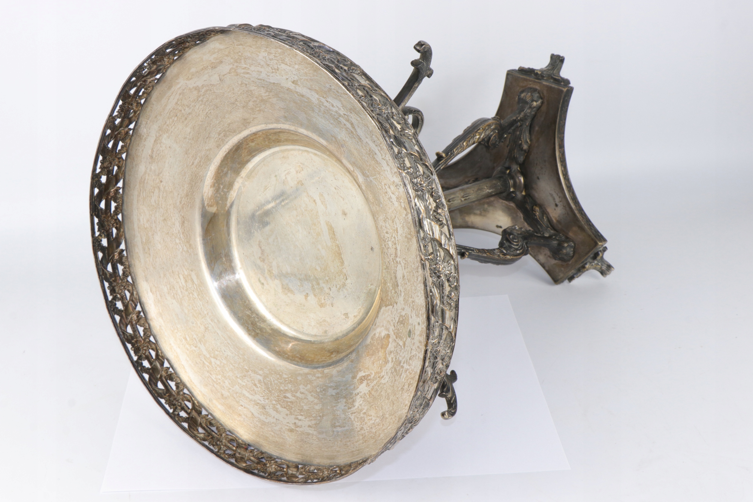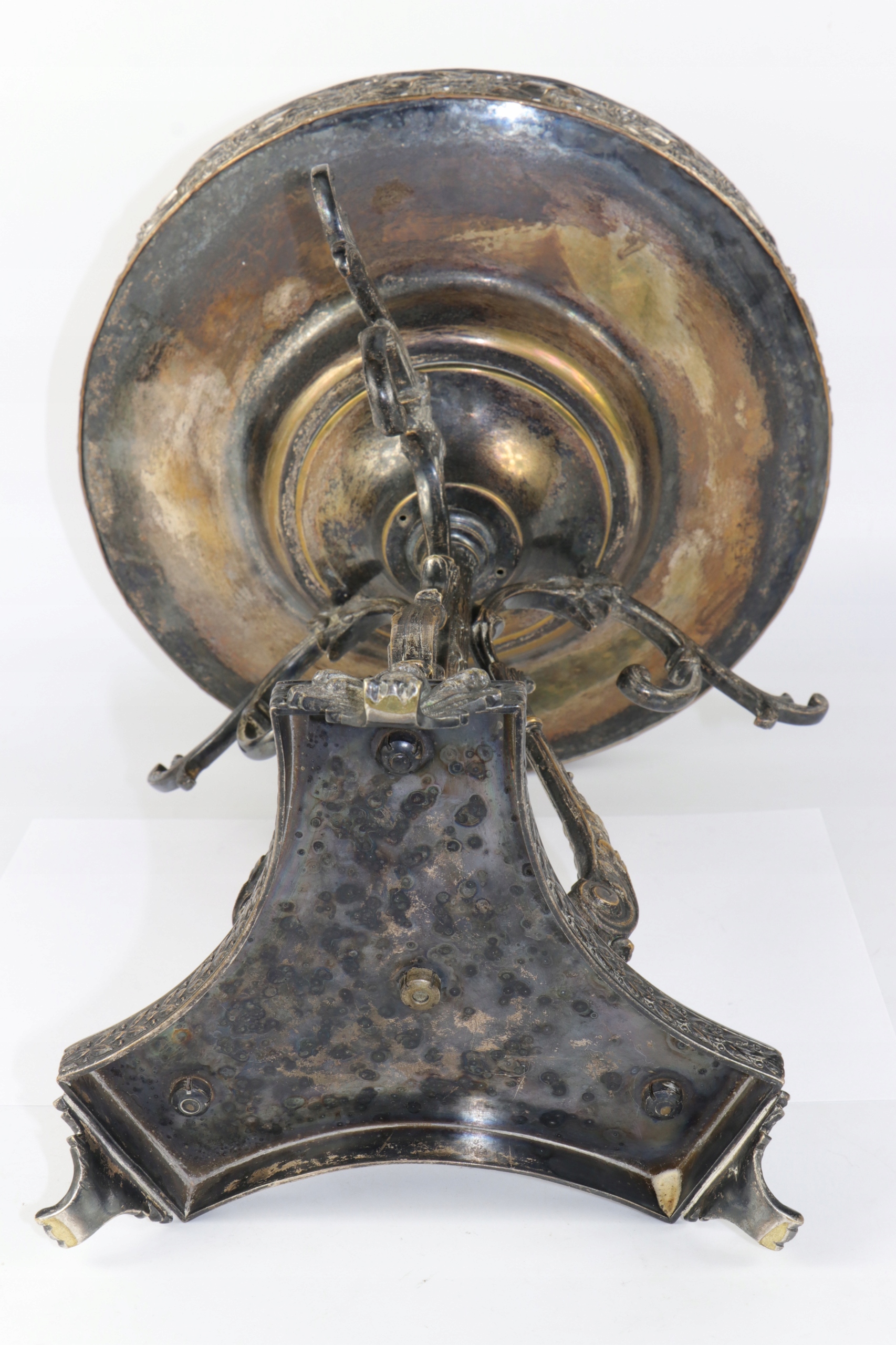 Огромная патера центра стола, украшенная красивым орнаментом. Центральные колонны, окруженные тремя опорами, заканчивались верхним краем львов с очень богатым узором с открытой работой с переплетенными цветами и лентами. Патера основана на одной колонке и три излучающих опорах, встроенных на основе трех ног. Патера в эклектичной форме со второй половины девятнадцатого века.