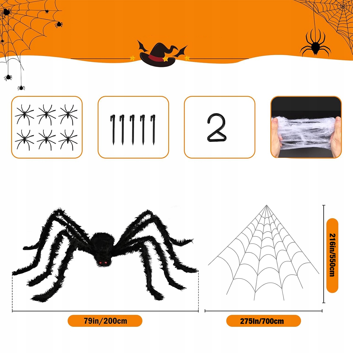Большой набор украшений для Хэллоуина: наш набор украшений для Хэллоуина «Паук» включает в себя гигантскую треугольную паутину 1 x 7 м, страшного большого паука 1 x 2 м, 30 мини-пауков и эластичную паутину весом 40 г (покрытие 300 м²), чего достаточно для жуткого и страшного украшения.