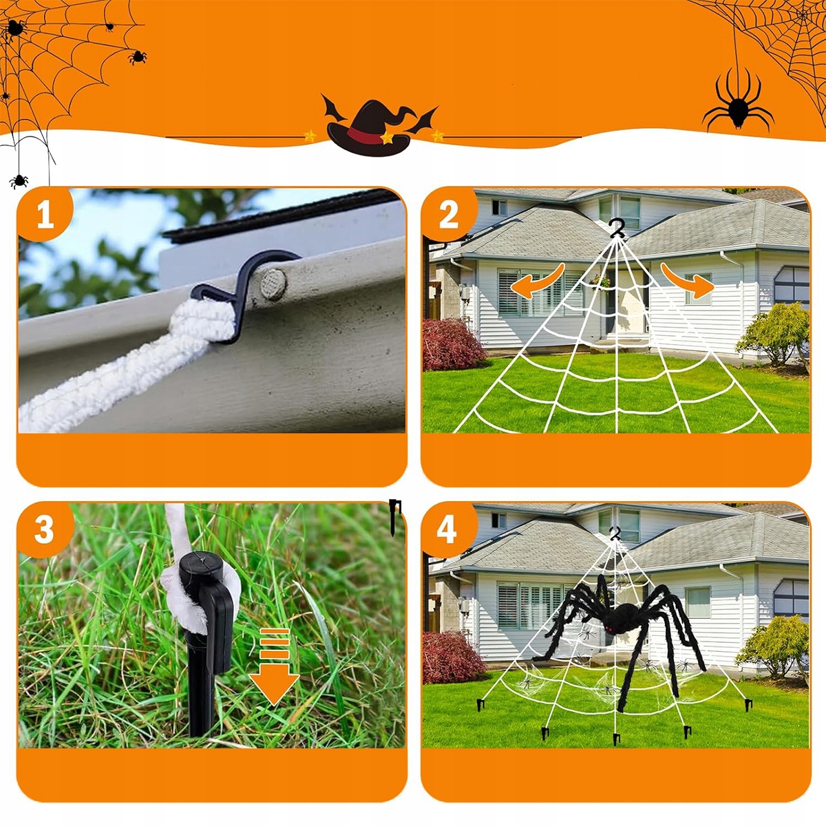 Нет беспорядка: просто воткните крючки в землю и повесьте веревку на желоб/стену/дерево в любом направлении. Ноги гигантского паука можно складывать по желанию. Кроме того, 30 маленьких пауков — растягивающаяся паутина достаточно гибкая, чтобы принимать любую форму.