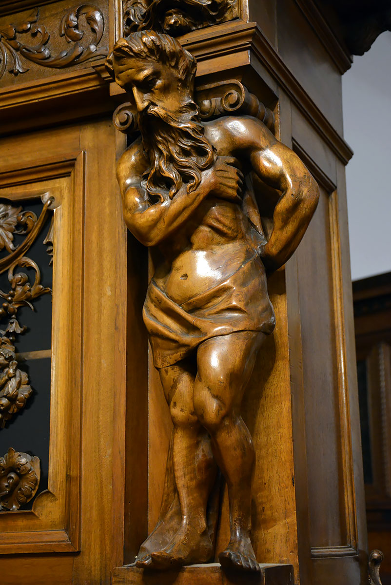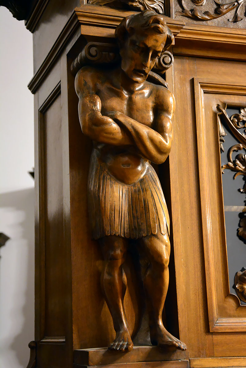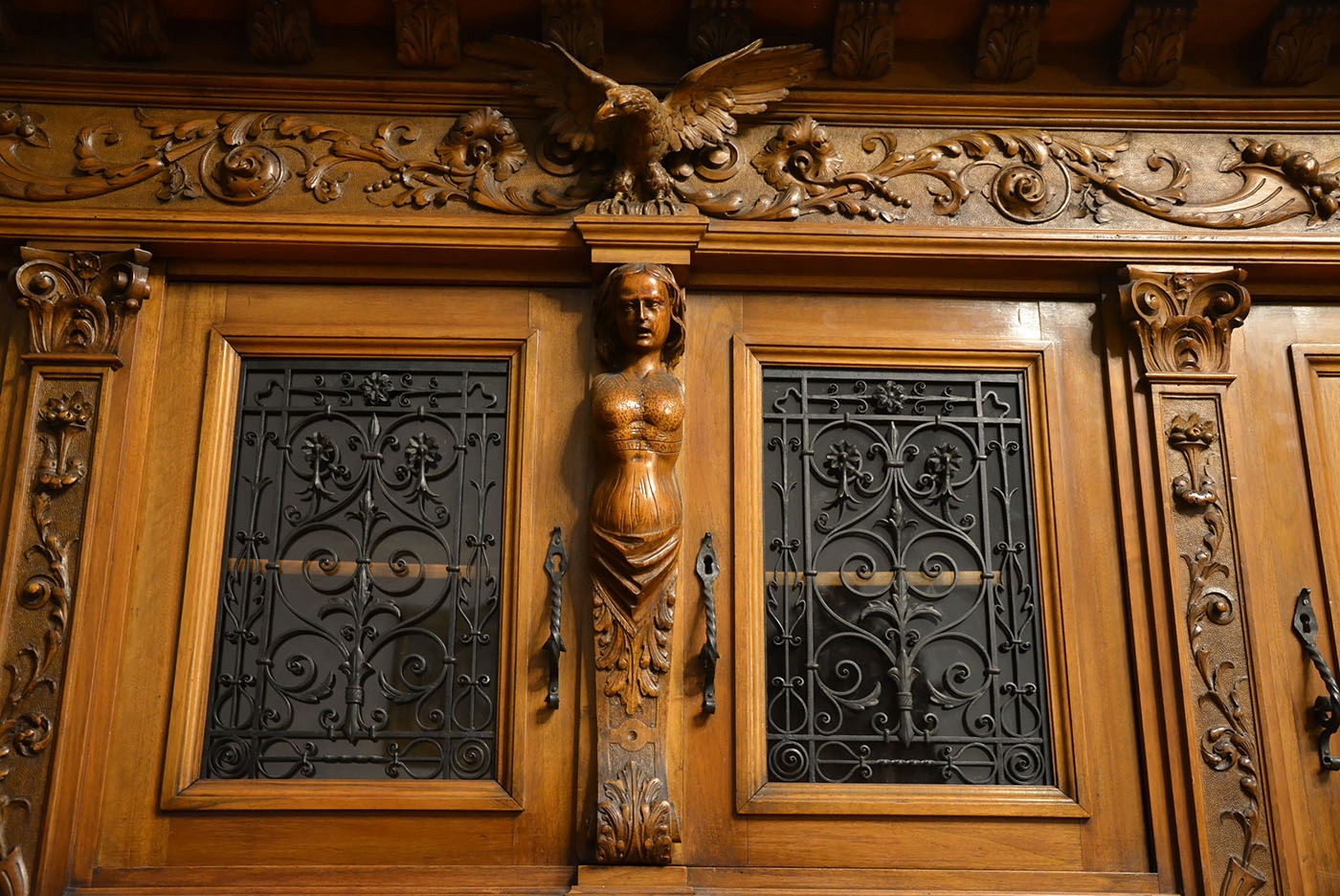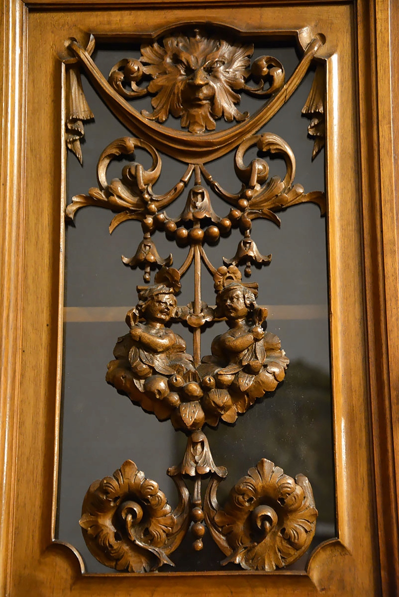 Боковые двери украшены ажурной резьбой с растительными мотивами, парой фигур и маской маскарона.