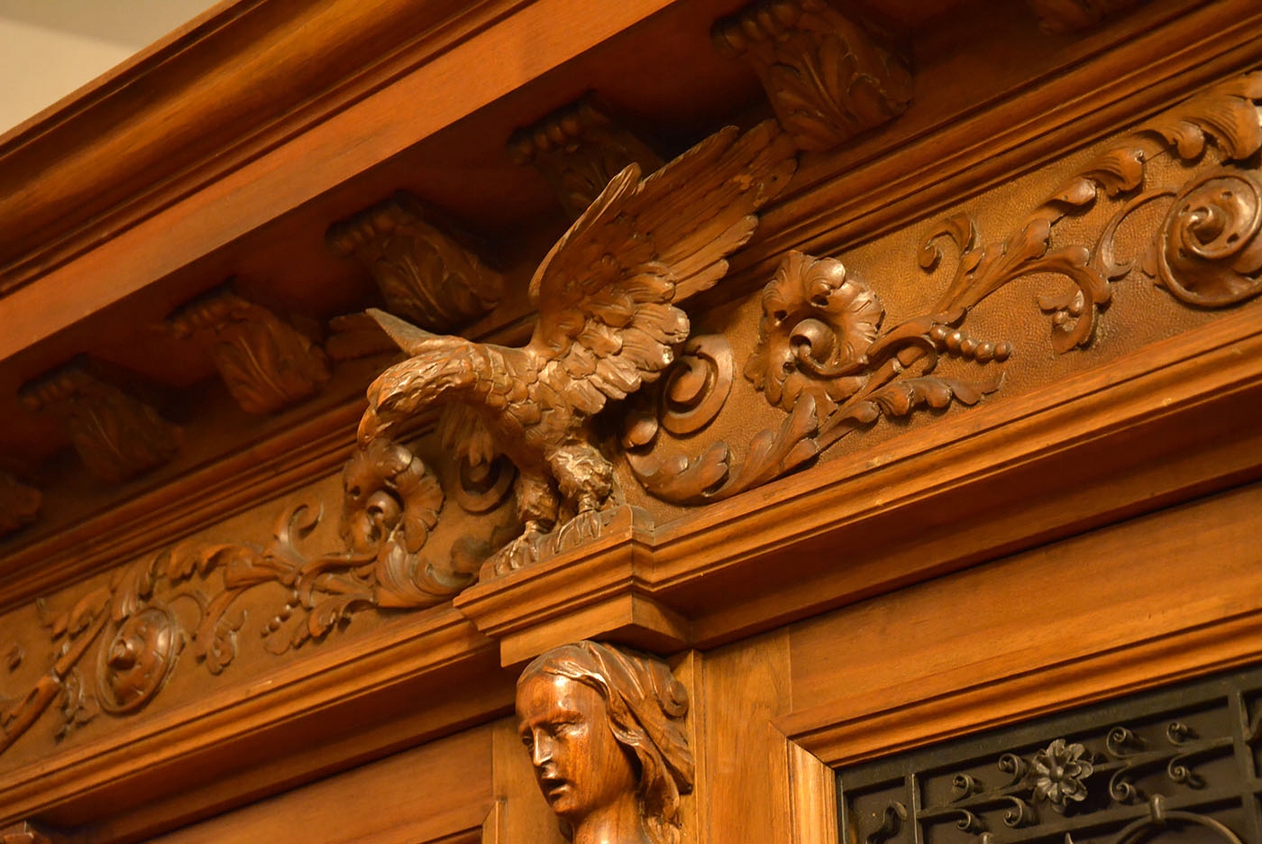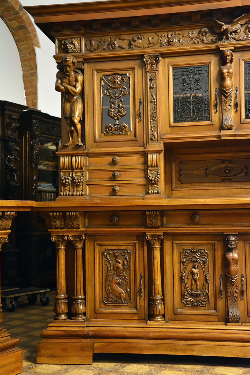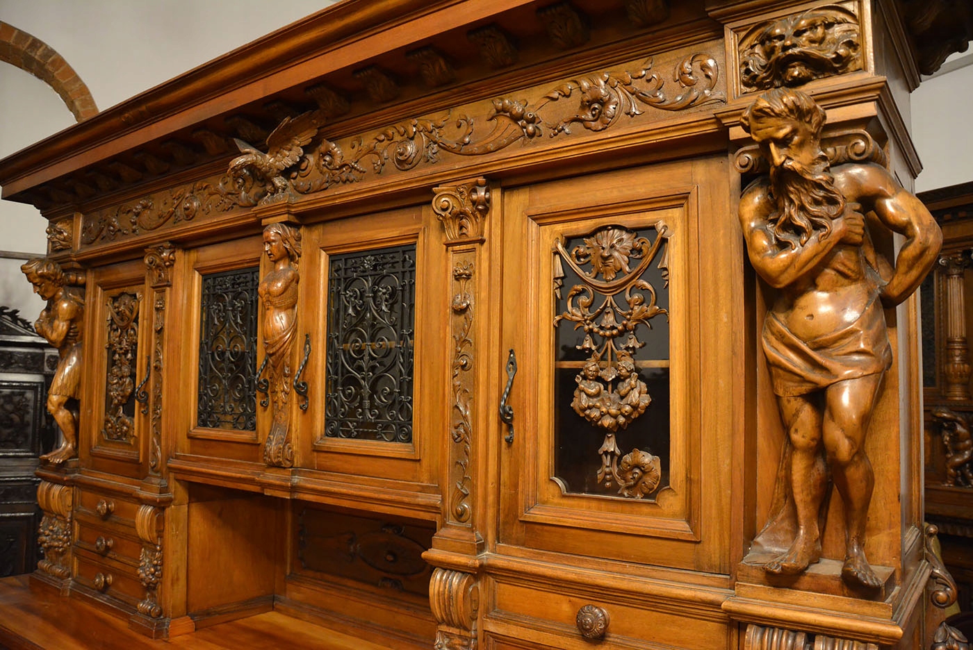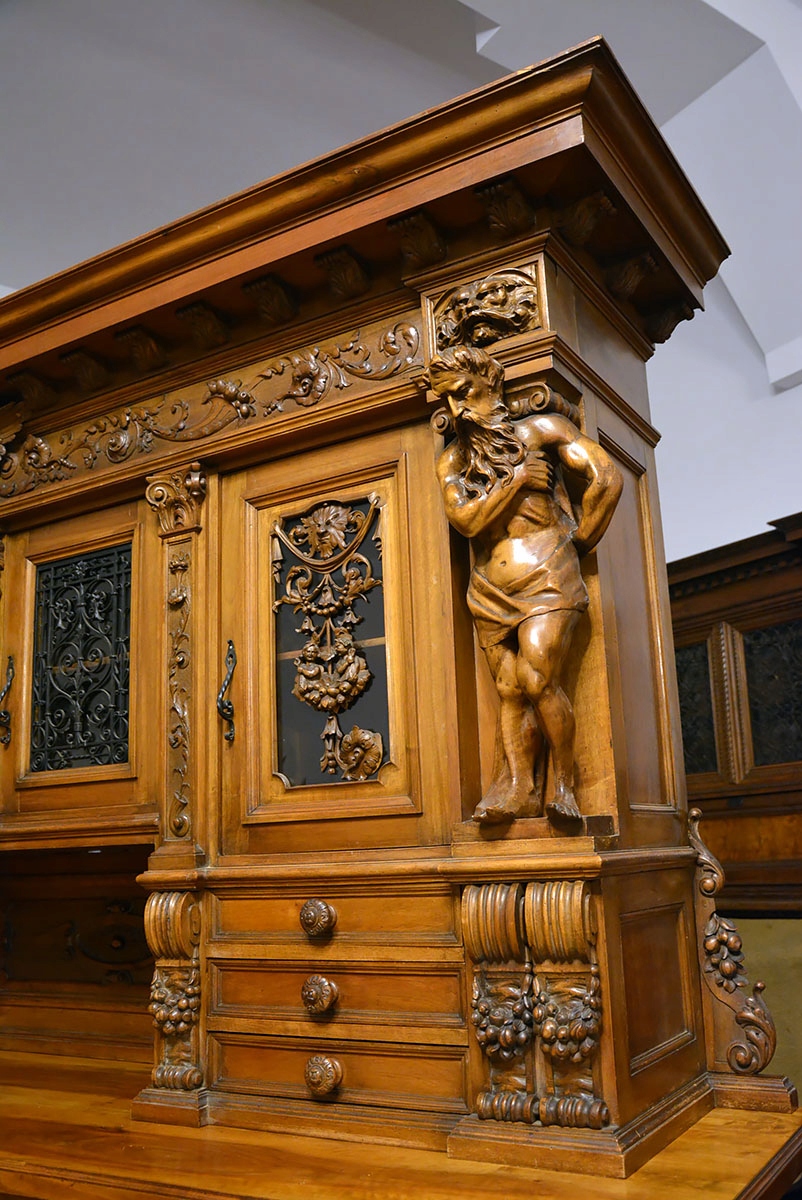 Боковые двери украшены ажурной резьбой с растительными мотивами, парой фигур и маской маскарона.