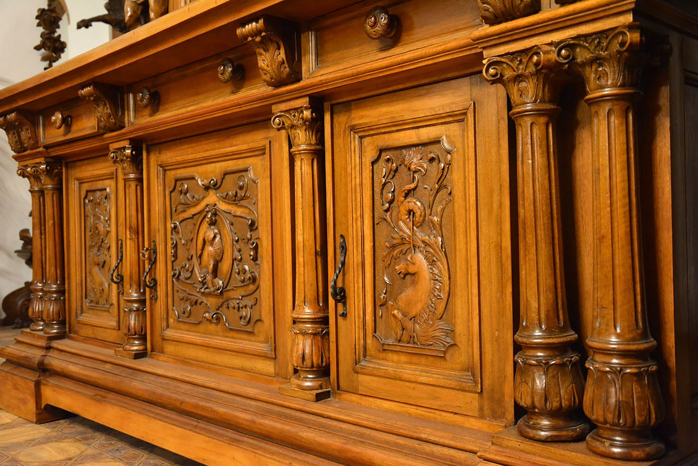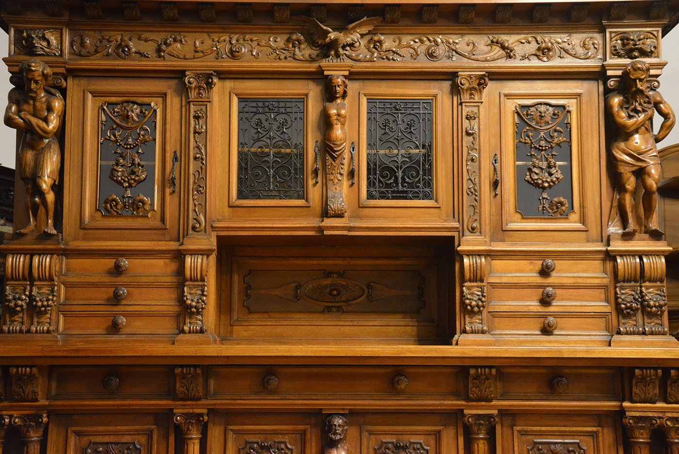 Буфет из двух частей. Нижняя часть в виде четырехдверного комода, разделенного пилястрами в виде рифленых колонн, увенчанных коринфскими капителями.