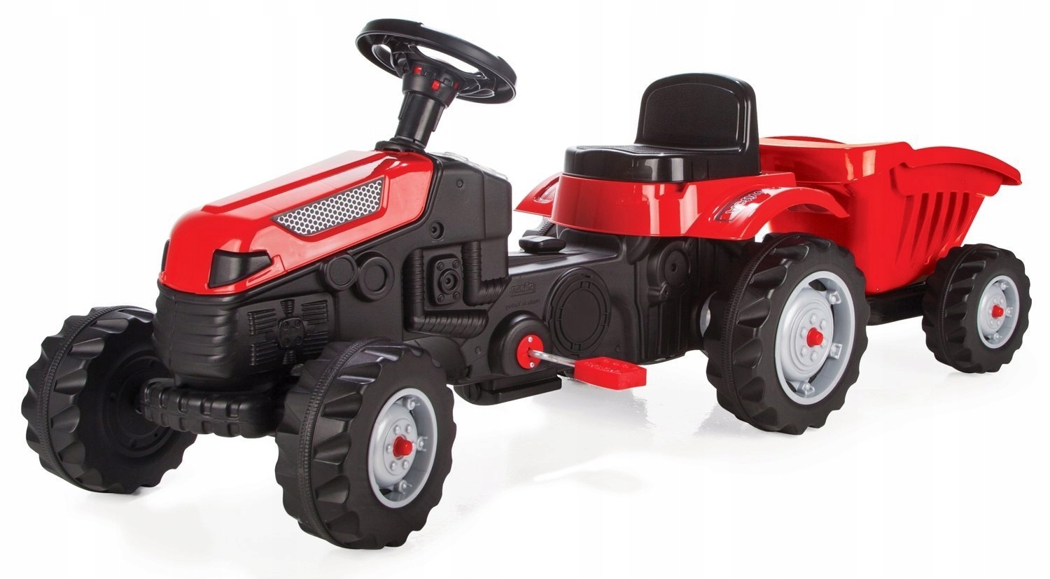 Удивительное удовольствие для маленьких любителей больших транспортных средств. Трактор доставит маленьким водителям много часов фантастического удовольствия. Фантастический педальный автомобиль со съемным прицепом и регулируемым сиденьем. Вместе с прицепом длина трактора составляет 143 см. Идеально подходит для игр дома и на улице.