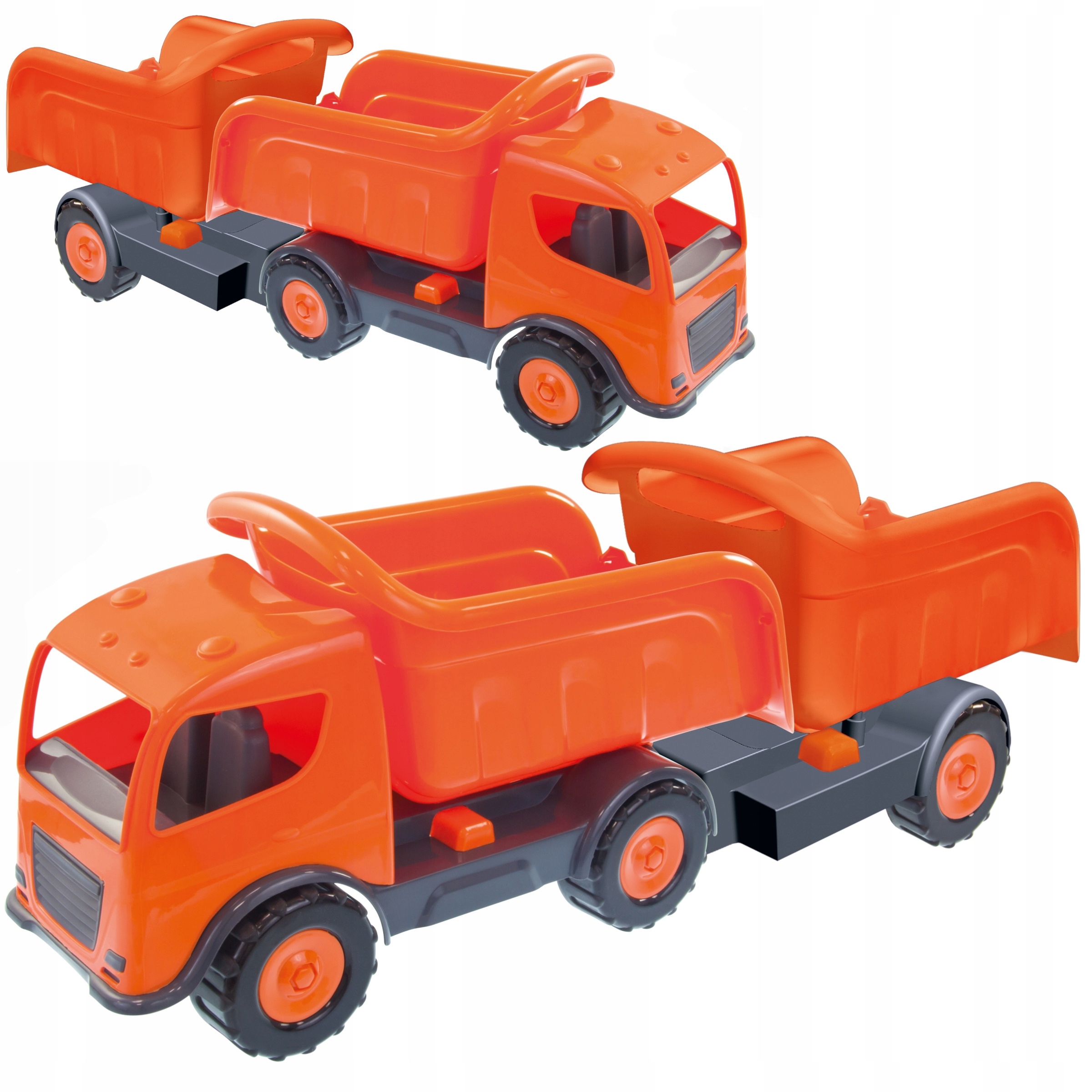 Огромный самосвал для игр в песочнице, на пляже, а также дома или на даче. площадка. Отлично подходит для строительных игр, транспортировки песка и других строительных материалов. Загрузите самосвал и прицеп до краев, доставьте груз на строительную площадку и разгрузите его. Самосвальный кузов может быть заблокирован. В задней части самосвал имеет крюк с прицепом. Игрушка изготовлена из прочного, высококачественного материала.