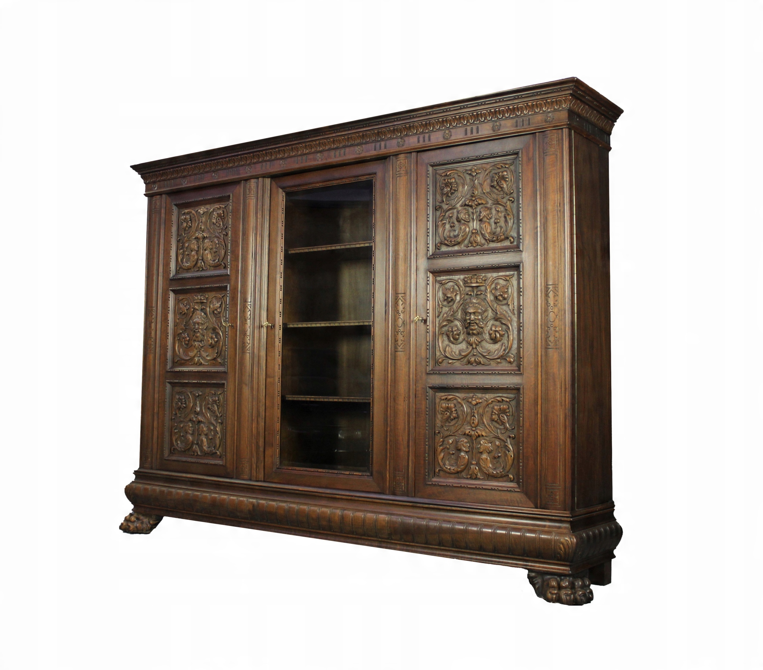 Величественная библиотека на львиных лапах. Предмет мебели уникальной массивной формы, характерной для стиля неоренессанс. В нем был проведен консервативный ремонт, оставив оригинальное чистовое покрытие. Все очень хорошо подогнано, продезинфицировано, нет неприятных запахов и насекомых. Замки функциональные, к каждому есть ключ. Мебель имеет обычные признаки использования. Состояние очень хорошее, готово к размещению.