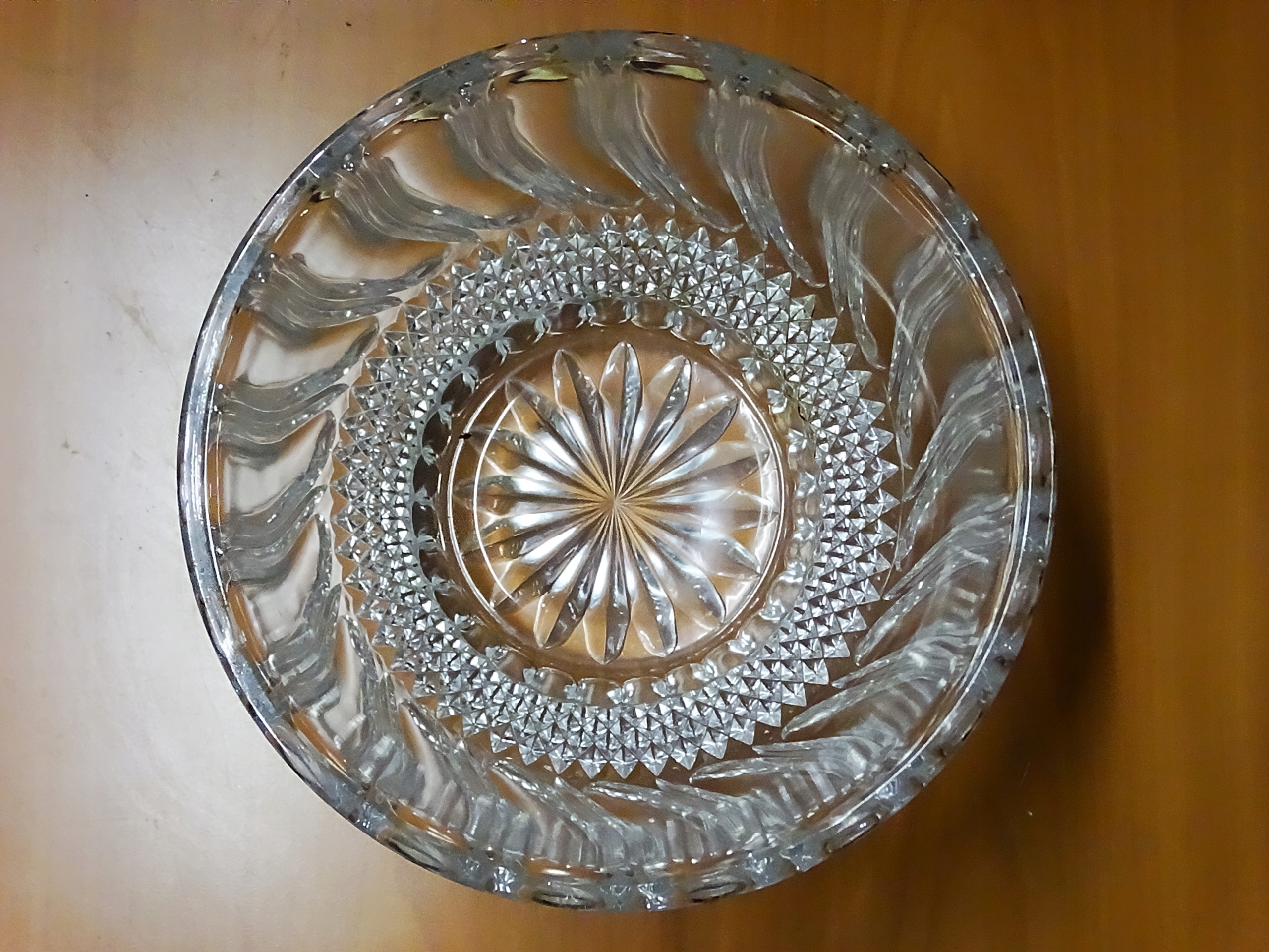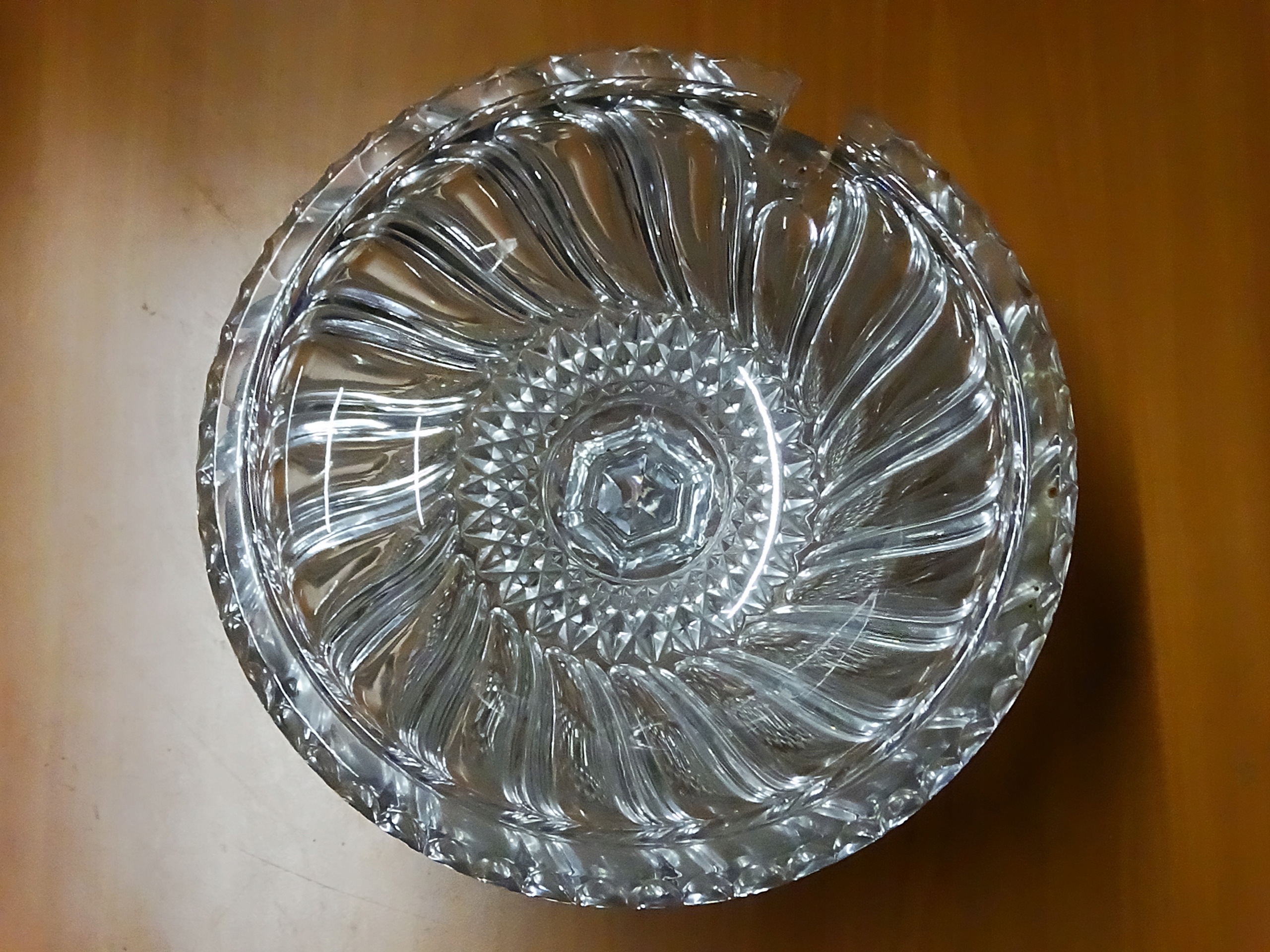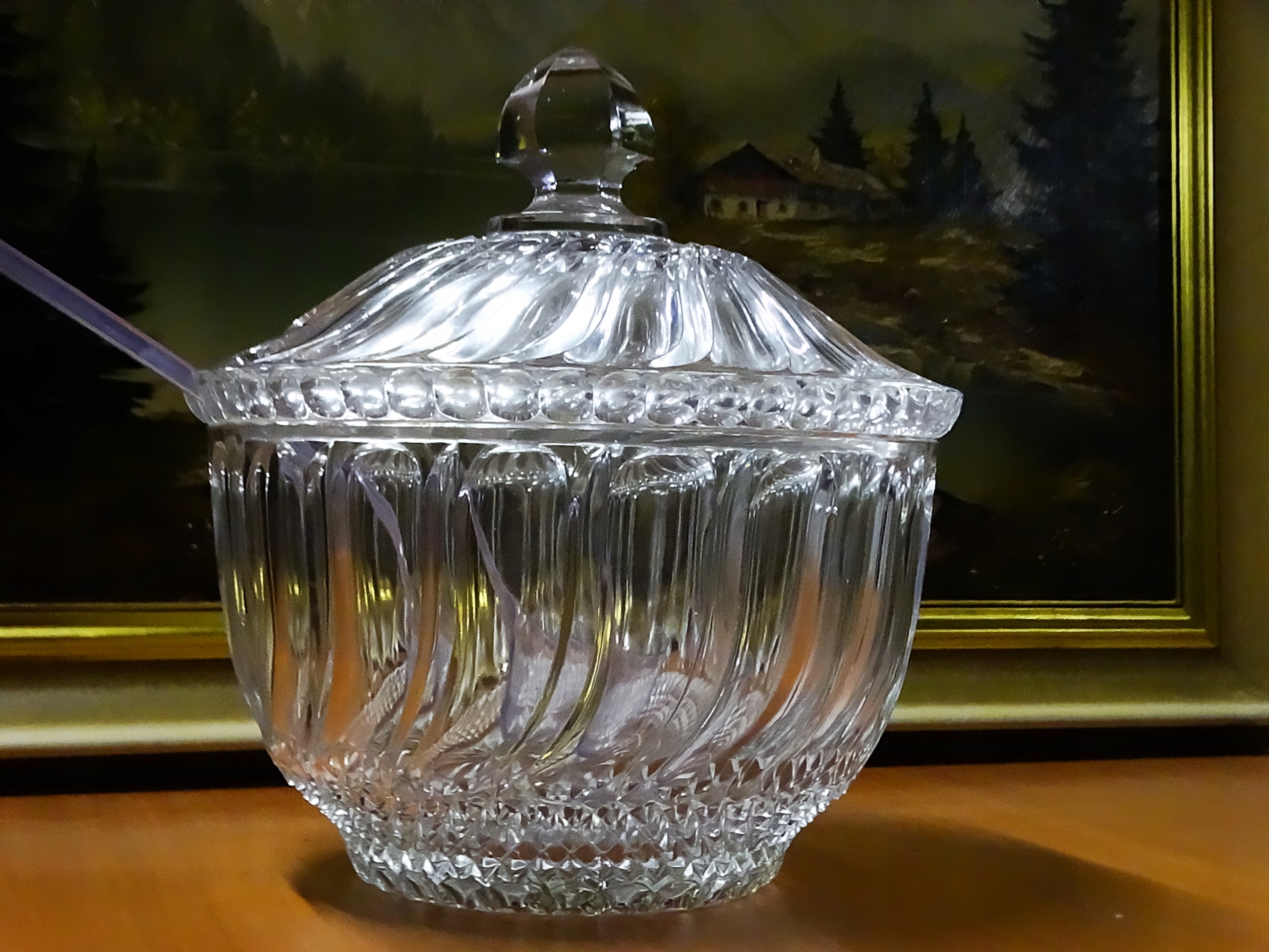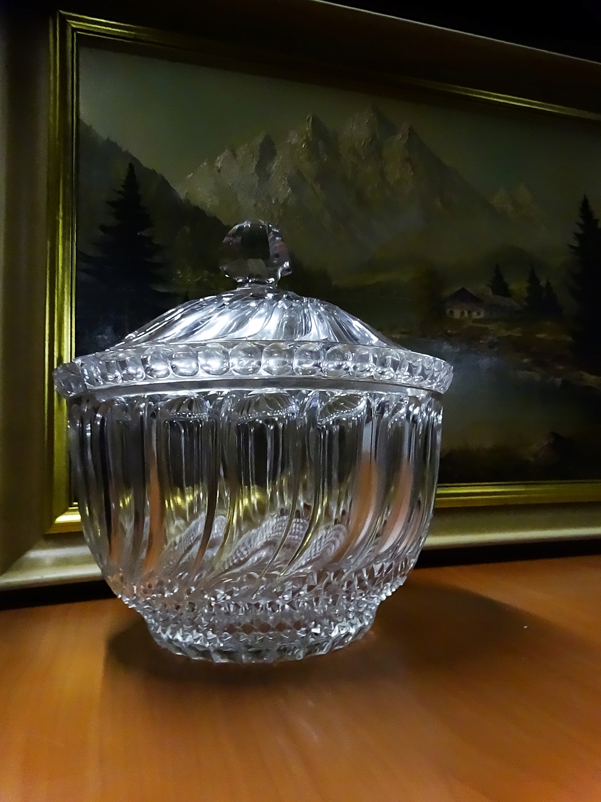 Большой, тяжелый, декоративный хрустальный сосуд с крышкой, традиционно используемый для подачи пунша, печенья или фруктов.