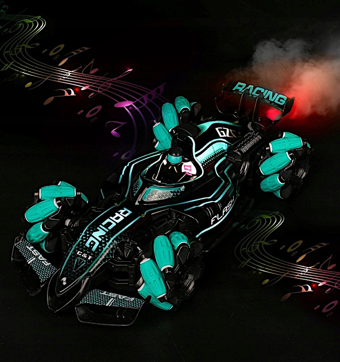Автомобиль оснащен генератором дыма, имитирующим выхлопные газы, выходящие из задней части автомобиля. Просто используйте прилагаемую бутылку, чтобы налить воду в контейнер, расположенный в задней части автомобиля, и нажмите кнопку активации на пульте дистанционного управления. Эффект вырывающихся водяных паров сопровождается вытяжной подсветкой, имитирующей огонь.