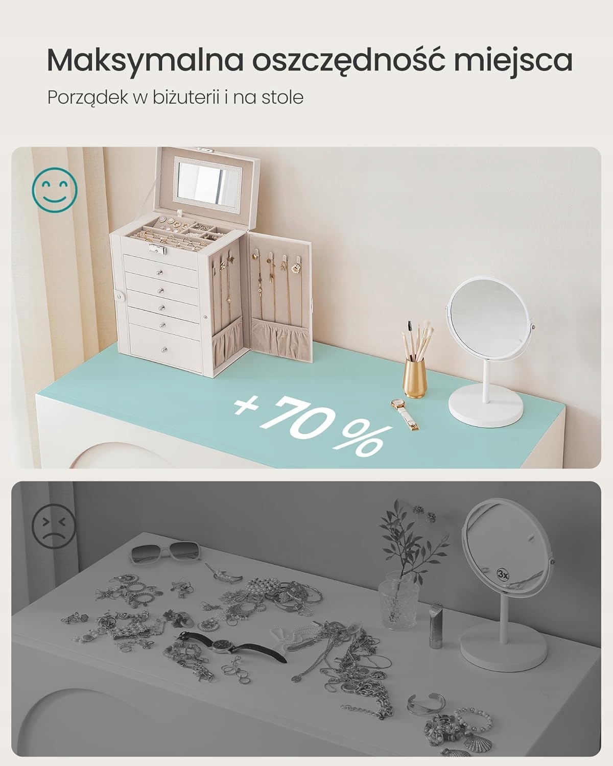 Большая многоуровневая белая шкатулка для драгоценностей с зеркалом.