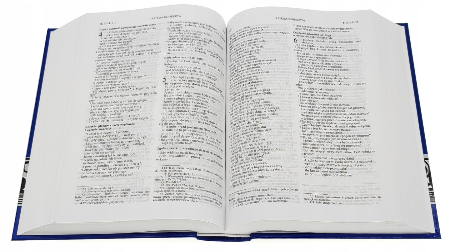 Тексты Библии Тысячелетия - 5-е издание Это единственное издание Библии на польском книжном рынке, содержащее Священные тексты в переводе, одобренном Конференцией Польских Епископов для использования в литургии Церкви. Содержит доступные комментарии — сноски, карты и удобный библейский словарь.