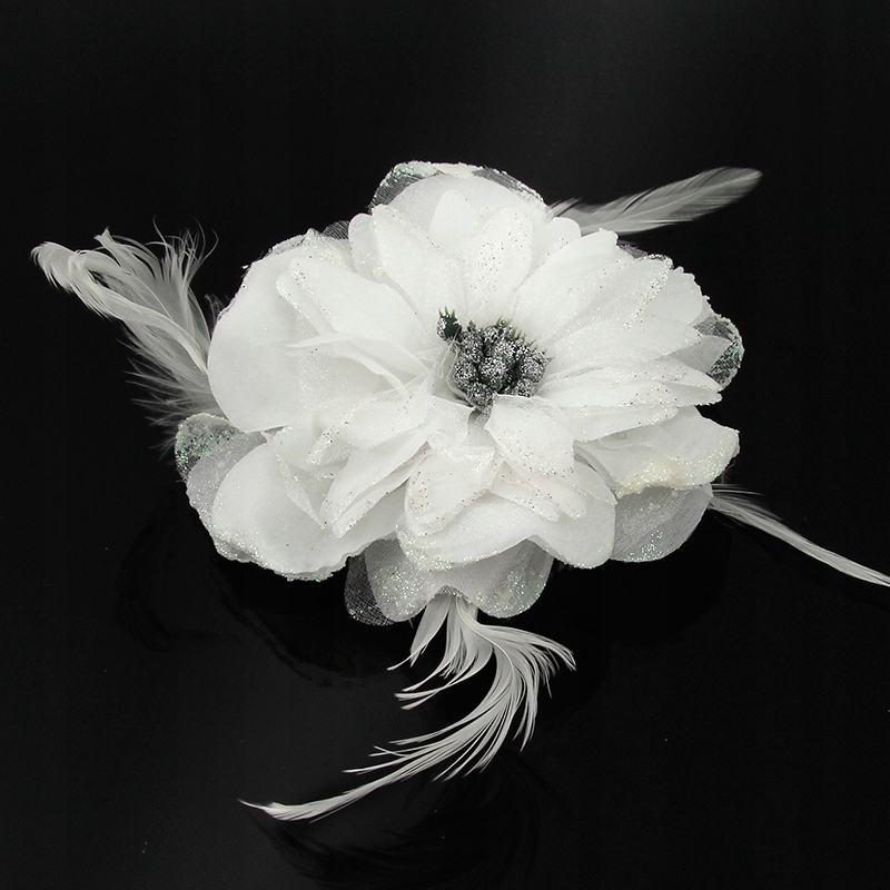 Красивый большой цветок с двумя застежками. По краям лепестки посыпаны блестками. Дополнительно цветок украшен перьями, которые при необходимости можно удалить.