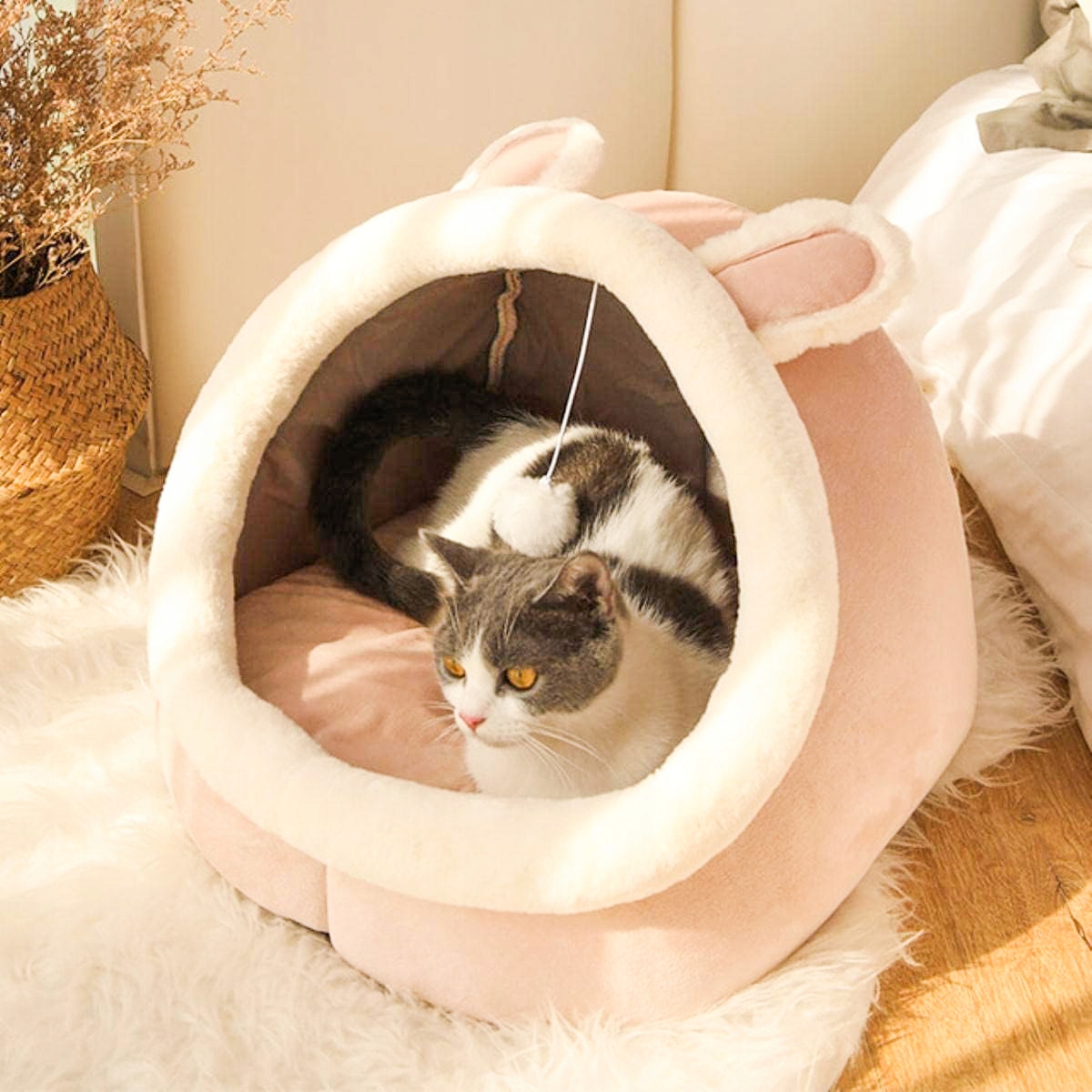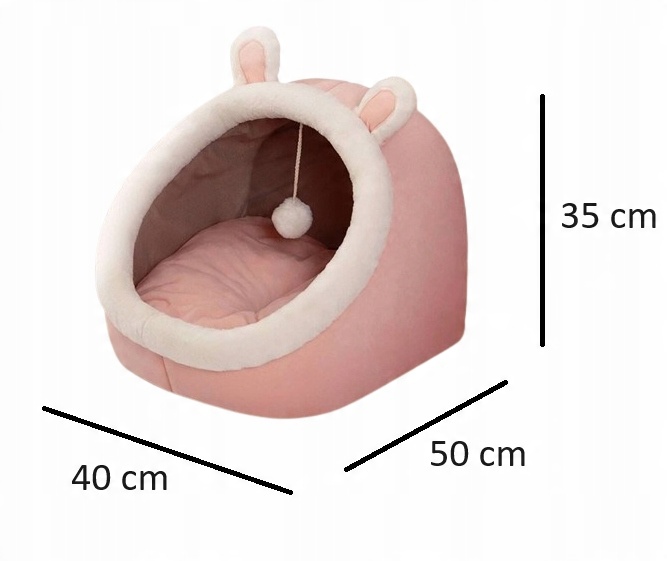 Кровать в форме домика обеспечит вашему питомцу спокойный и комфортный отдых. Эстетичный дизайн дома с очаровательной отделкой в виде ушек также порадует глаз и впишется практически в любой дизайн интерьера. Конструкция в форме капюшона гарантирует, что вашему питомцу будет тепло и комфортно во время отдыха или сна. Подвесной аксессуар внутри конуры в виде мехового комочка сделает отдых вашего питомца еще приятнее.
