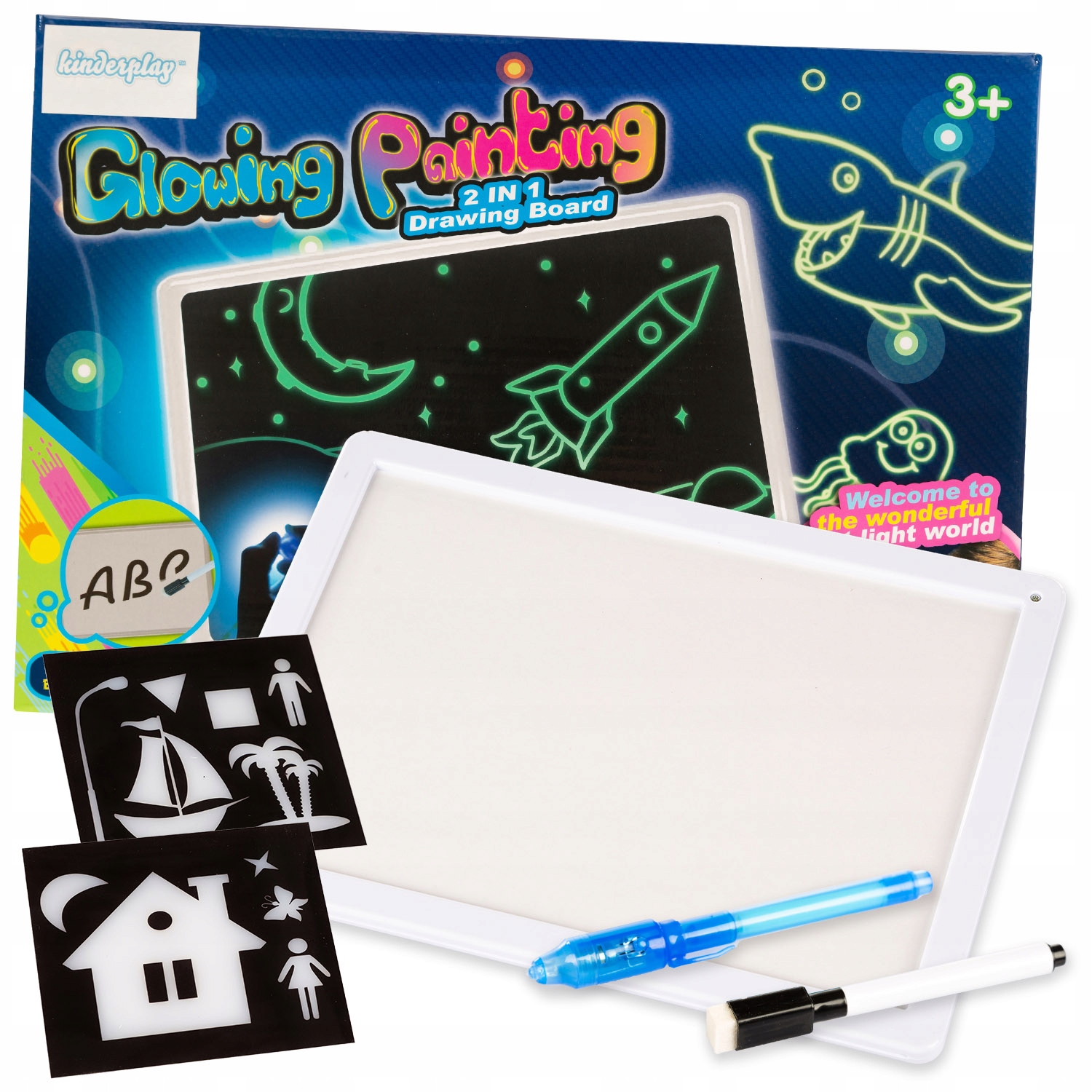 Наш набор оснащен световой доской для письма, ручкой с УФ-светодиодом и двумя трафаретами для рисования. Плюсом световой доски является ее оригинальность, легкость, удобство использования и самое главное - она не пачкает руки!