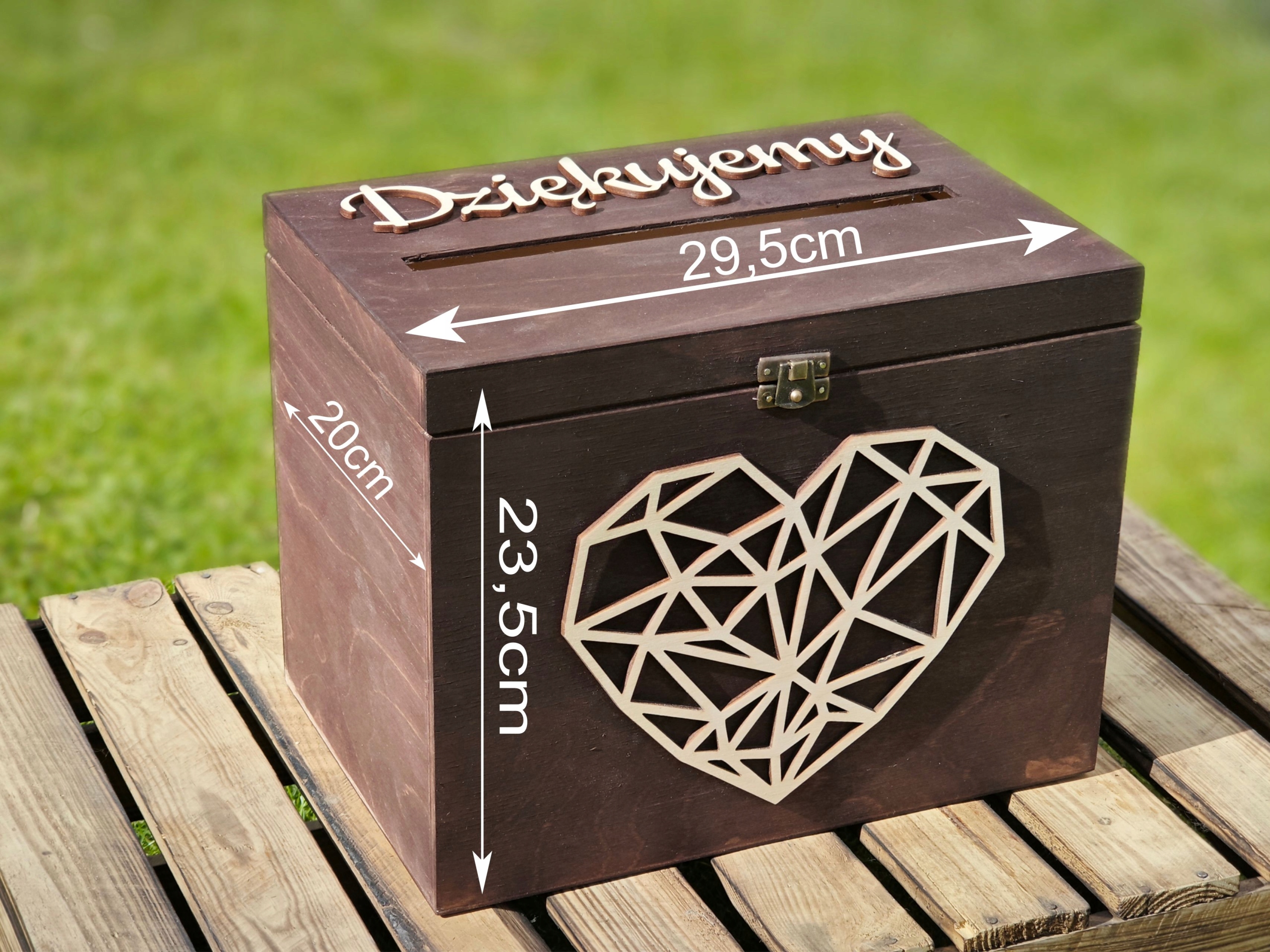 Большая деревянная шкатулка-коробка для свадебных конвертов с надписью «Спасибо» и сердечком, закрытая на замок. Самыми распространенными подарками жениху и невесте являются конверты с деньгами, поздравительные открытки, скретч-карты или лотерейные билеты. Наша большая деревянная коробка для свадебных конвертов идеально подойдет для этого особенного дня: в нее можно поместить все, что угодно. Наша шкатулка сочетает в себе функциональность с элегантностью и выполнена с вниманием к каждой детали. Коробка-конверт имеет большое отверстие вверху. Ящик закрывается на защелку, что обеспечивает безопасность и очень функционально. Ящик 100% экологический, изготовлен из дерева. Надпись спасибо и сердечко, вырезанное из фанеры натурального цвета.